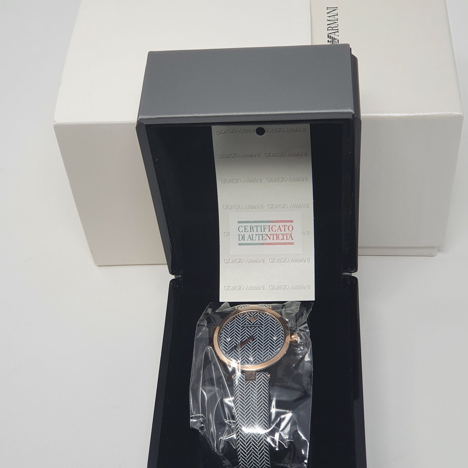 A design that uniquely flows through the dial to the bracelet, this Emporio Armani Rose Gold Tone Ladies Watch combines a stunning print with subtle hints of rose tone to create a striking look.