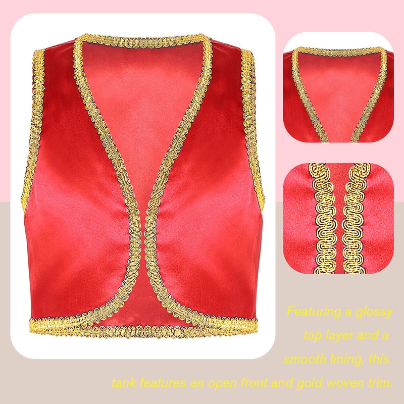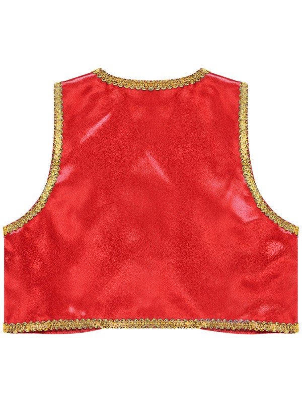 The vest designs with a glossy top layer and smooth lining, open front and adorns with golden braided trimmings.