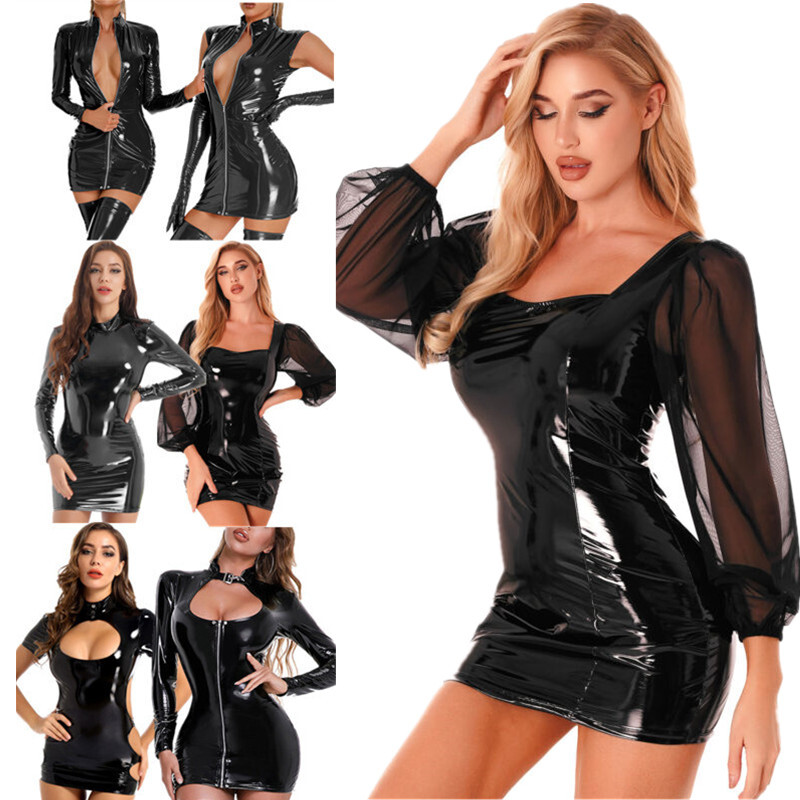 Women's Wet Look Patent Leather Bodycon Mini Dress Sexy Zipper Lingerie Clubwear