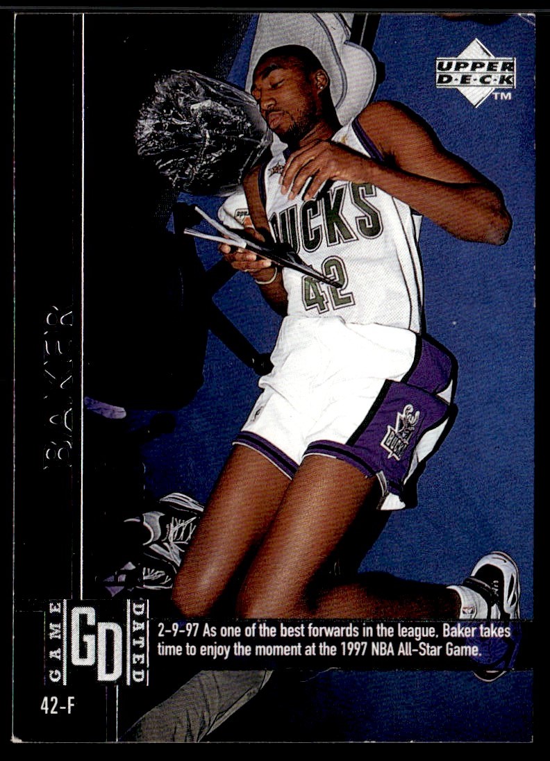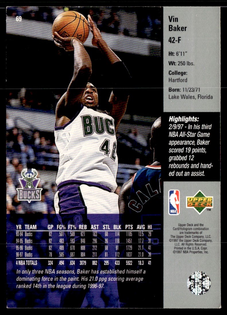 | Description: | Vin Baker | | Category: | Basketball | | Year: | 1997 | | Product: | Upper Deck Game Dated | | Team: | Milwaukee Bucks | | Card Number: | 69 | | Dimensions: | 3½" x 2½" |