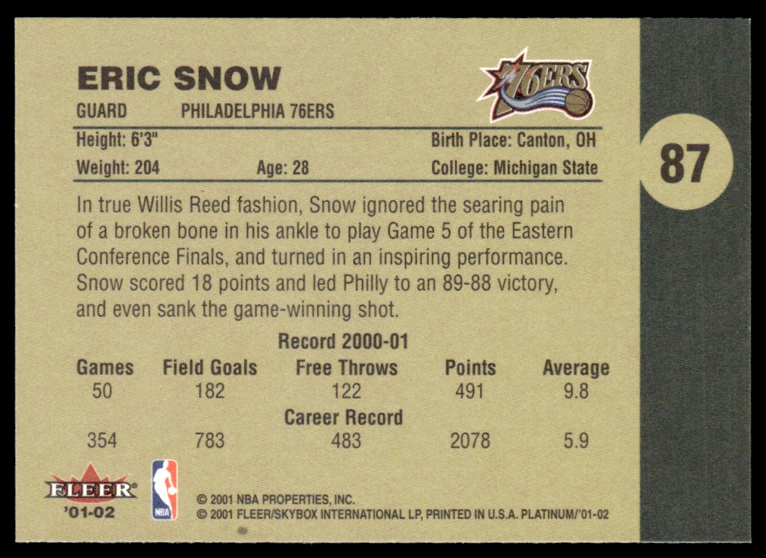 | 2001-02 Fleer Platinum 87 Eric Snow | ||||||||||||||||