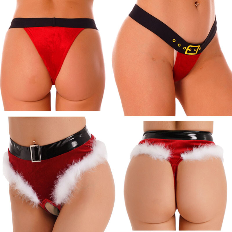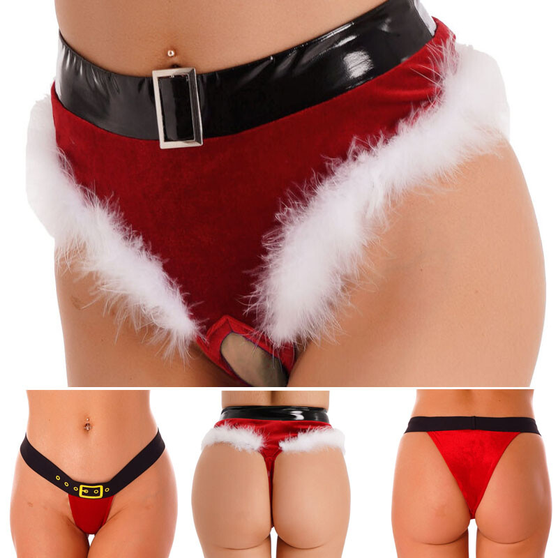 Womens Christmas Feather Trim Velvet Briefs Crotchless Thong Panties Underwear.