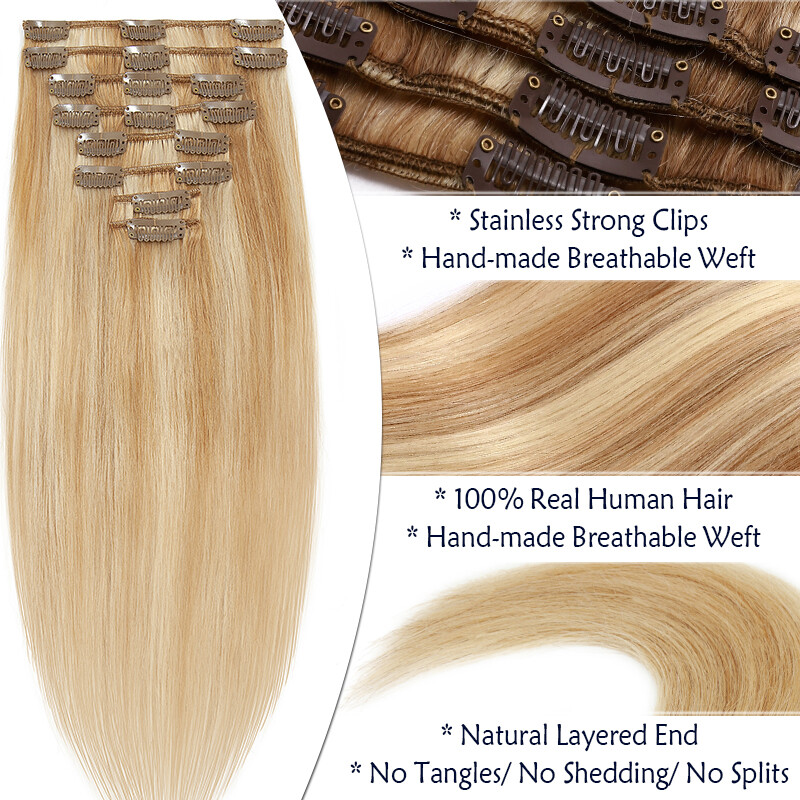 | Smooth Human Hair Extensions Clip In 100% Real 8 Pieces 18Clips Russian Blonde | ||||||||||||||||||
