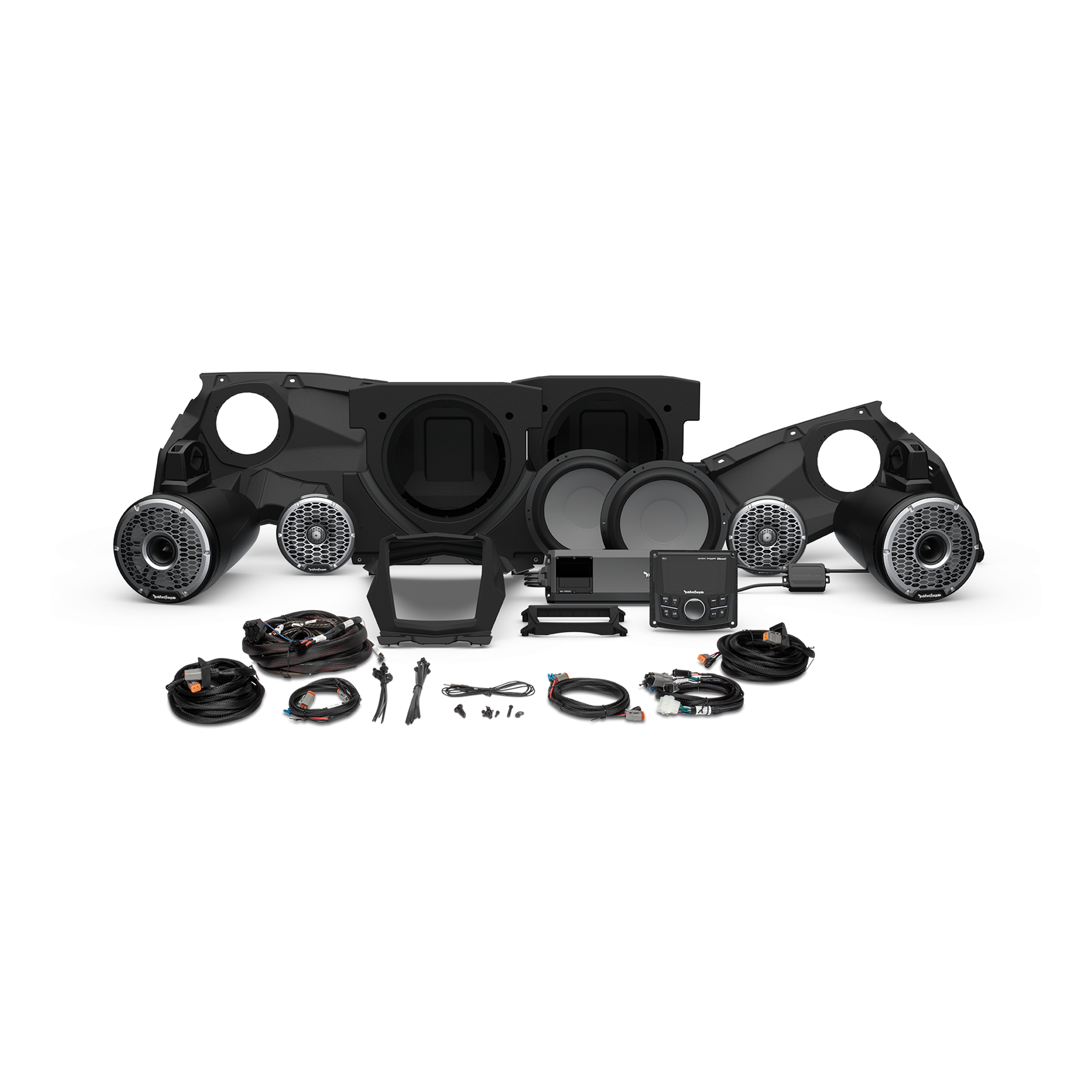 This Rockford Fosgate Stage 6 audio upgrade kit is the absolute ultimate in audio systems Fits For Can-Am Maverick X3 models. With a digital media receiver, two 6-1/2" front speakers, two 8" rear speakers, two thunderous 10" subwoofers, and a 5-channel amplifier, this Color Optix enabled system really rocks. Each component is built for max performance and tough enough for trail duty, so you can crank it up without worrying about your stereo getting swamped.
