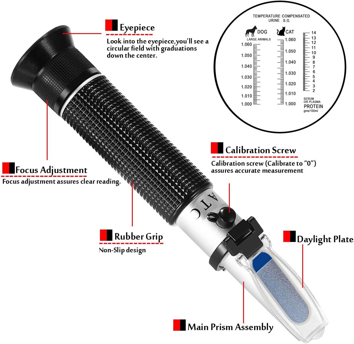 It provides triple scale which can read Specific Gravity (S.G.) of Dog Urine, Specific Gravity (S.G.) of Cat Urine,and Serum or Plasma Protein (SP).