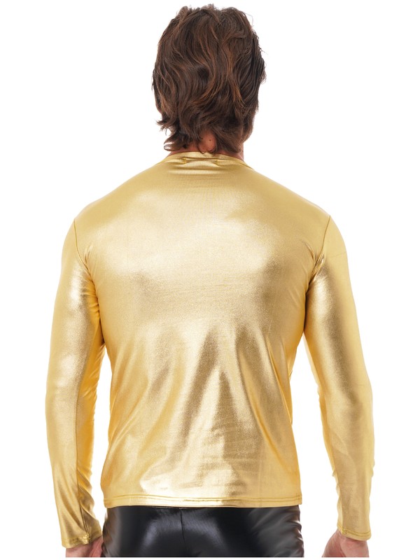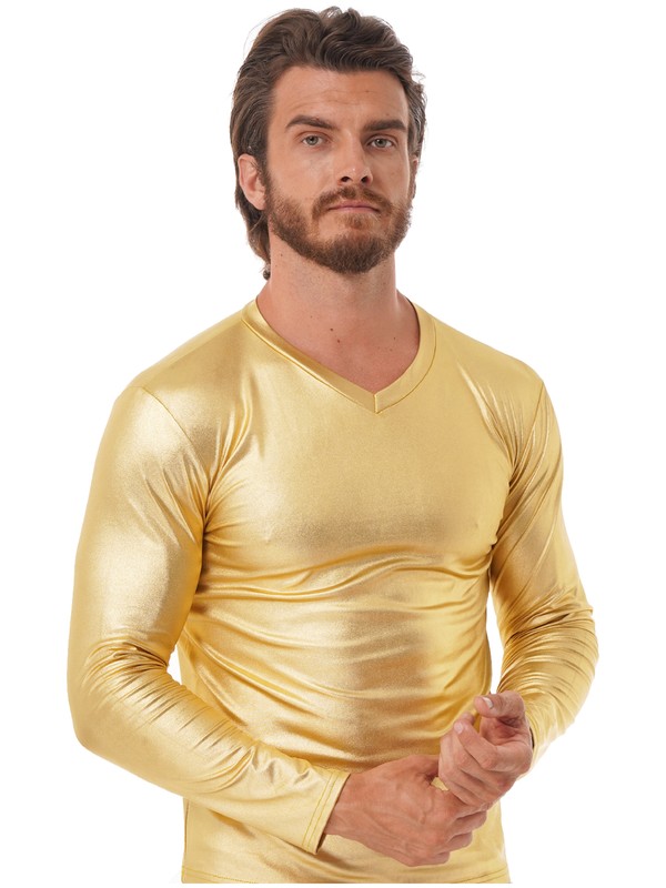Men Glossy Slim Fit V Neck Long Sleeve Tops Metallic Shiny Faux Leather T-shirt.