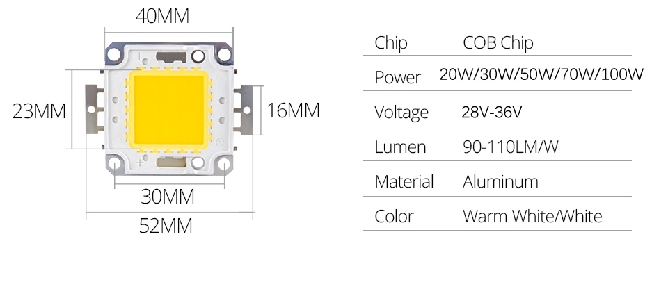 | Wattage | 10W | 20W | 30W | 50W | 70W | 100W |