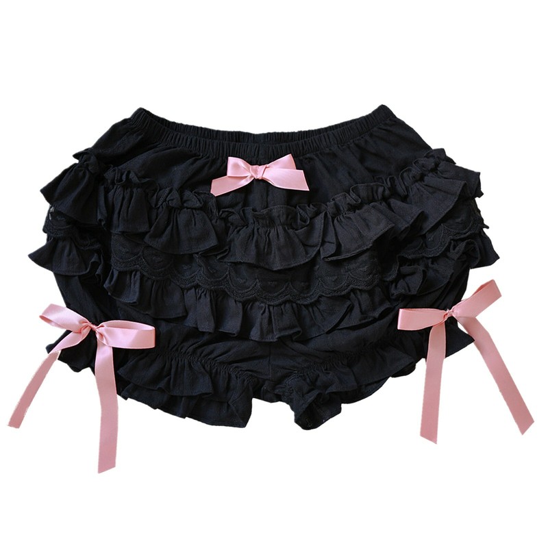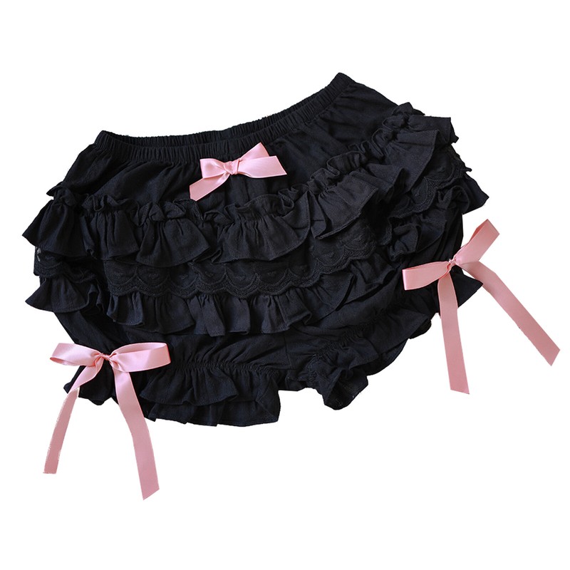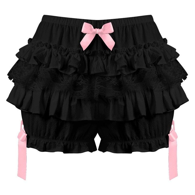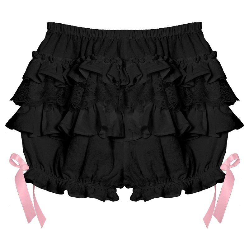 Women Lace Trim Layered Ruffle Bloomers Elastic Waistband Bowknot Decor Frilly Panties Shorts.