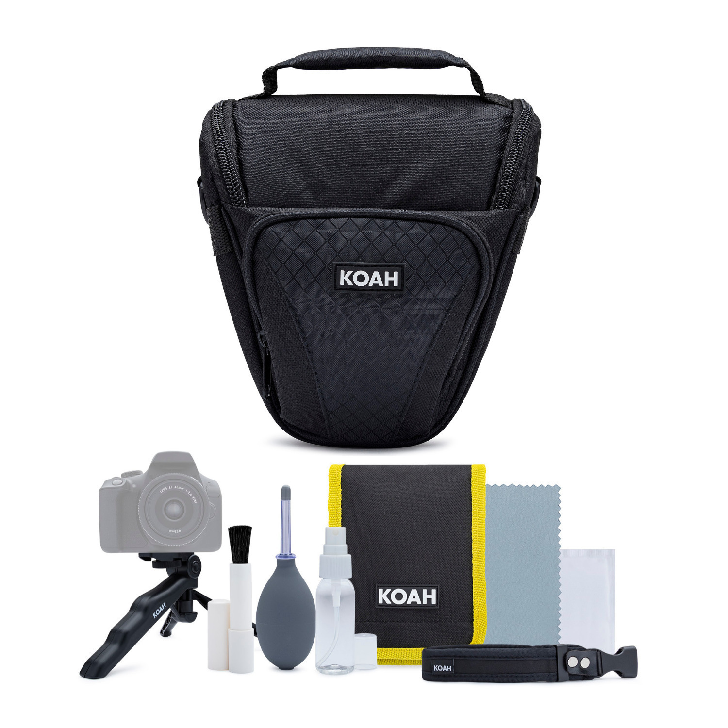 The Koah Holster Camera Case with Accessory Bundle gives you all the items to accessorize your compact DSLRs or Mirrorless cameras and keep them safe. This bundle includes a Holster Camera Case, Compact Mini Tripod, Microfiber Lens Cloth, Fine Bristle Cleaning Brush, Lens Cleaning Wipes, Lens Cleaning Spray Bottle, Rubber Bulb Air Blower, Straps, and finally a small Carrying Pouch to store these accessories.