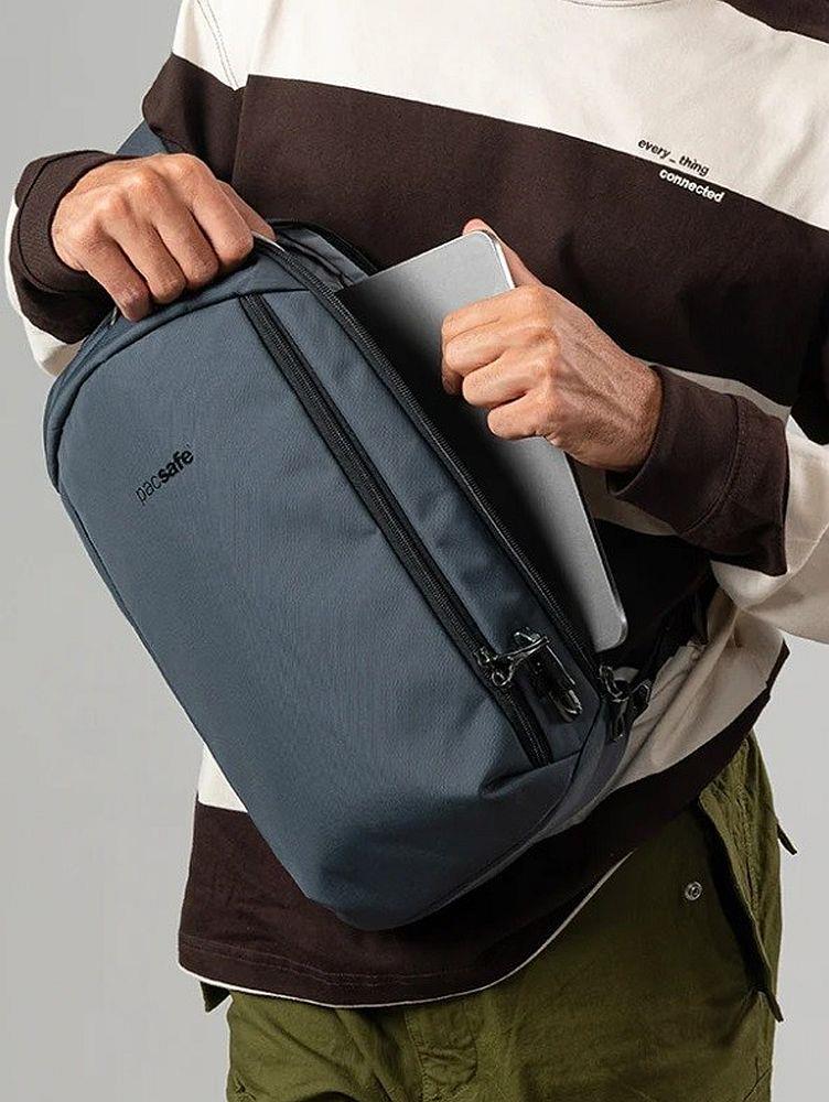 Protect your valuables and our planet with this deceptively spacious 10 litre V Tech sling pack. Made from post-consumer recycled polyester (rPET), equivalent to 12 recycled plastic bottles, the Pacsafe V Tech Sling is also treated with a 100% PFC-free water repellency to keep your kit dry on the go.The V Tech can be worn on your back, or across your front to access things quickly, has innovative anti-theft technology to give extra confidence when hitting the streets, including a padded sleeve to fit most 11" tablets.