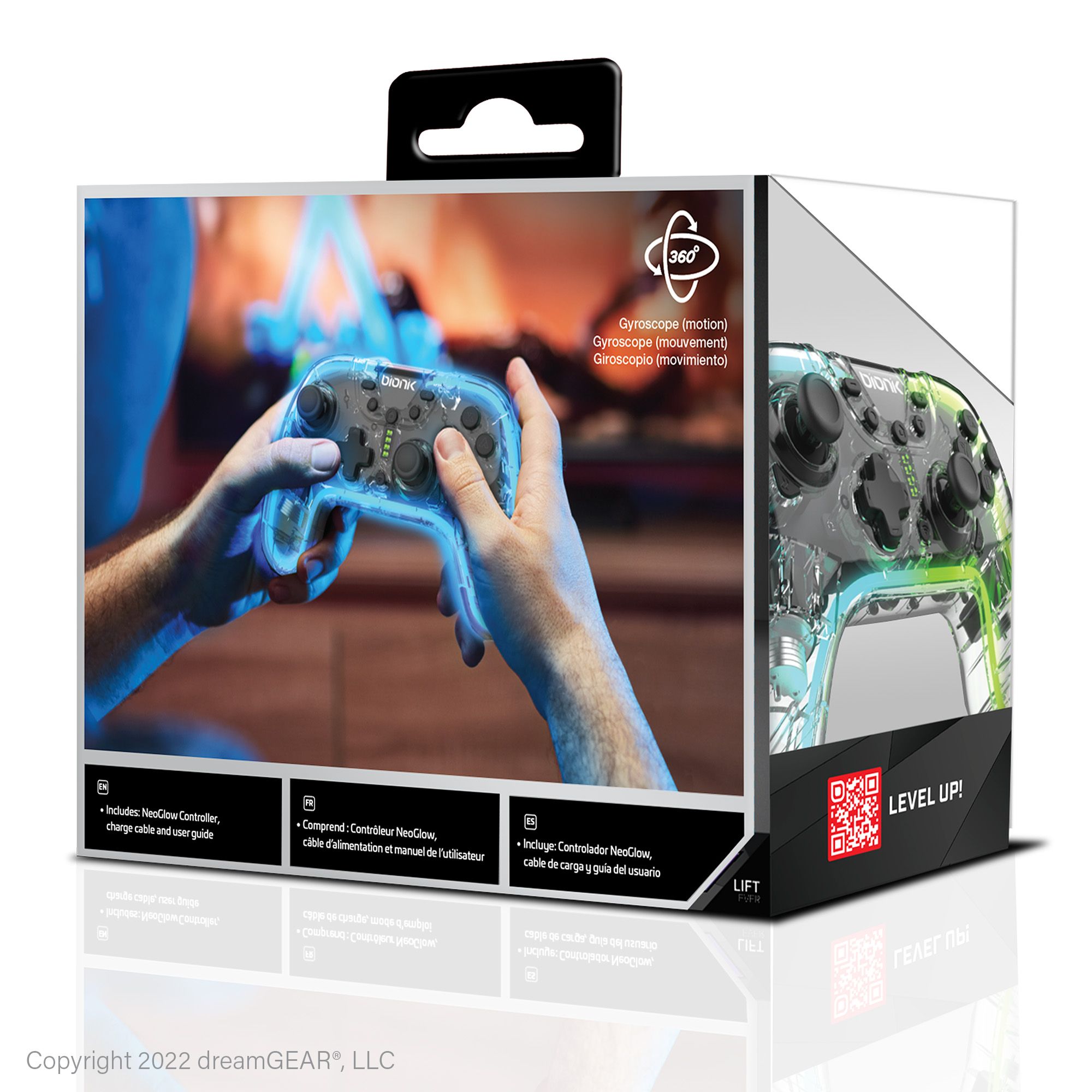 The NeoGlow Controller features a transparent shell that is framed with RGB tube lighting to show o the millions of color combinations. Play wirelessly for 40 plus hours on a single charge or play wired with the included 10-foot cable. This fully featured controller fits your gaming needs and color style, so LEVEL UP with the NeoGlow Controller from bionikĀ®