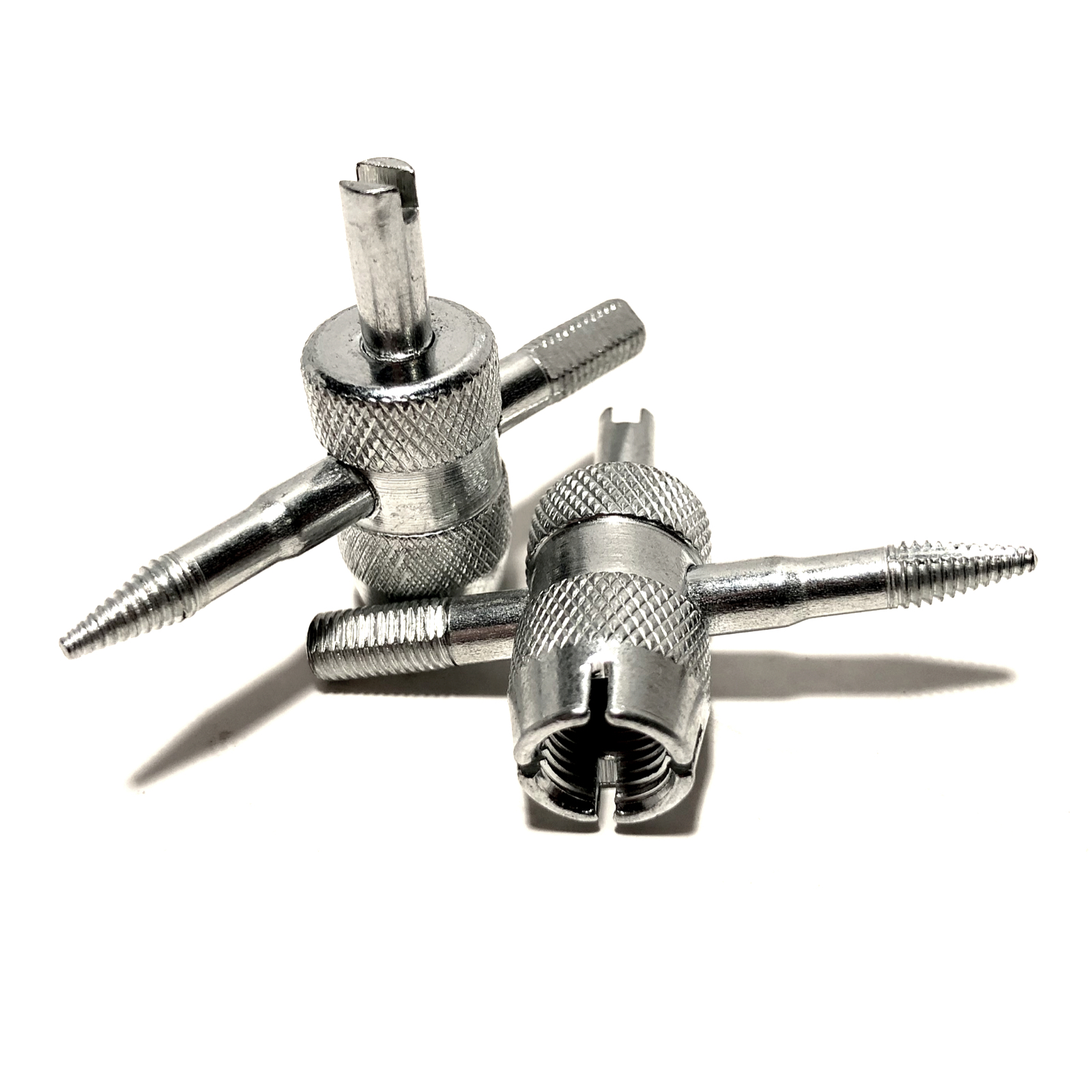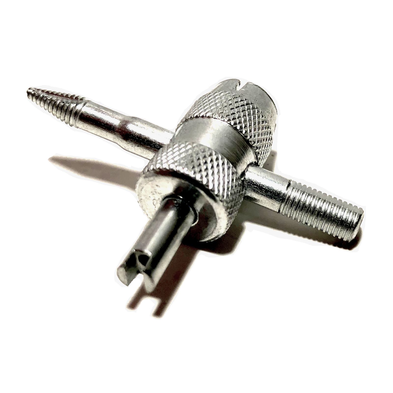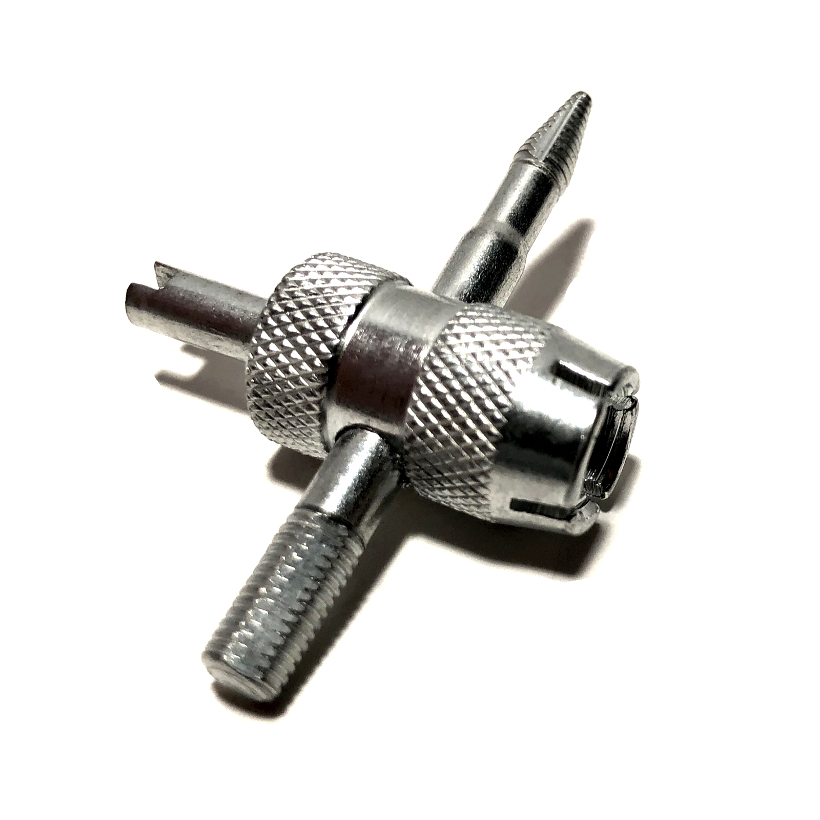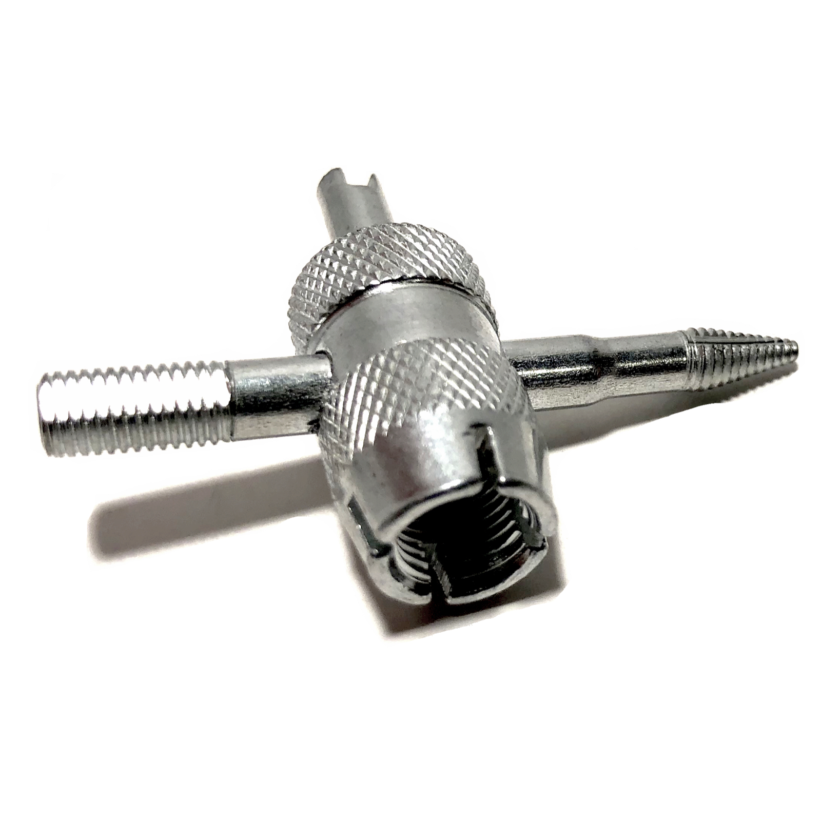 Welcome to quality with a TYK Industries brand 4 Way Tire Valve Stem Core Remover. The pocket size and convenience of four tools in one makes this a great valve tool to keep in any repair kit. The heavy-duty construction makes it ideal for shop use. This tool loosens and tightens the valve core, cleans the valve core threads, recuts and cleans internal threads, recuts and cleans external threads. and reams the inside of the valve housing. TYK Industries branded products are always durable and dependable. It's great for use in tight and confined places, whether you're working on a truck, car, motorcycle, bicycle, lawn mower, trailer wheel or tire.