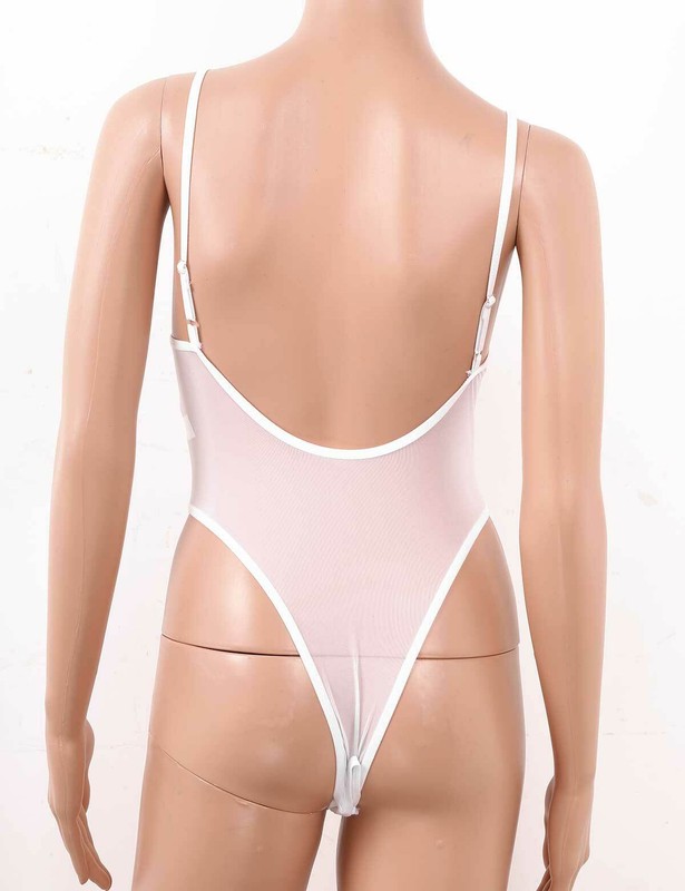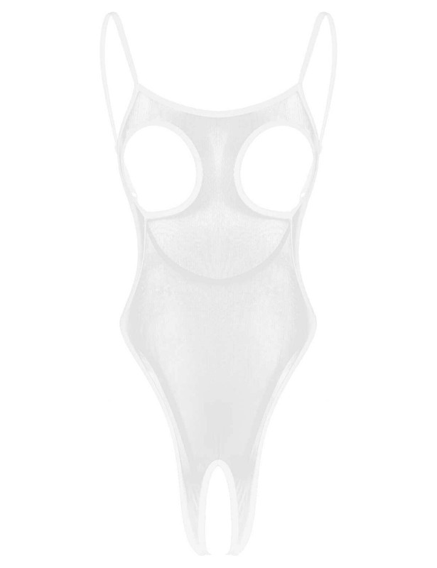 See-through sheer mesh design with adjustable spaghetti shoulder straps, breast hollow out, backless and crotchless, high cut legs.