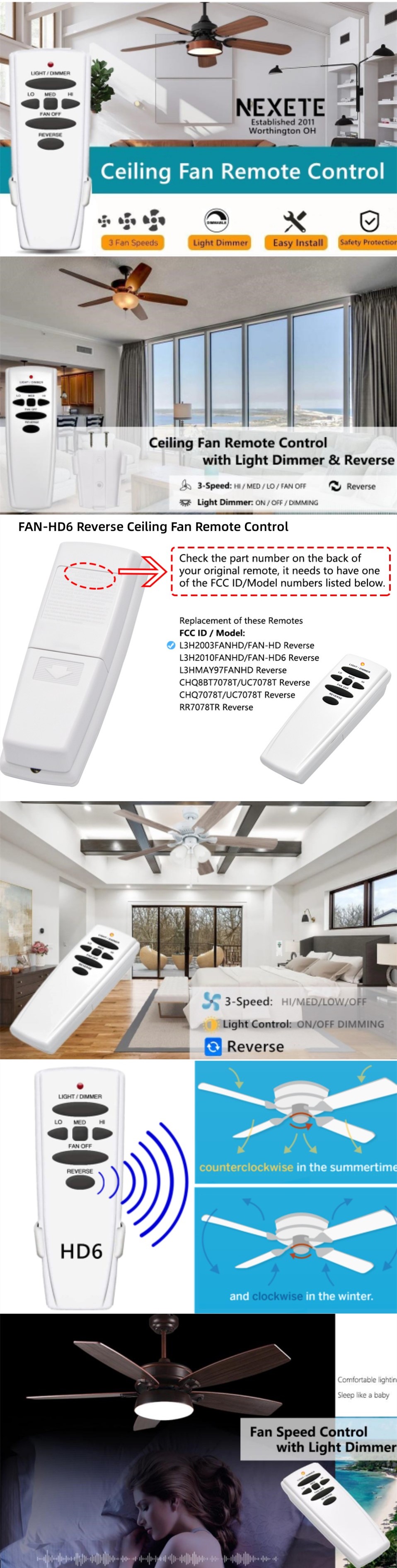 Common Q&A of customers BelowWhat is the function of this HD6 ceiling fan remote control replacement? Compatibility Does it support to control multiple ceiling fans Can 1 remote control 2 fans? Can 2 remotes to control 1 fan? Does it work with the fan which have no light kits? Pack Included: 1 x Fan Remote 1 x User Manual (English) |