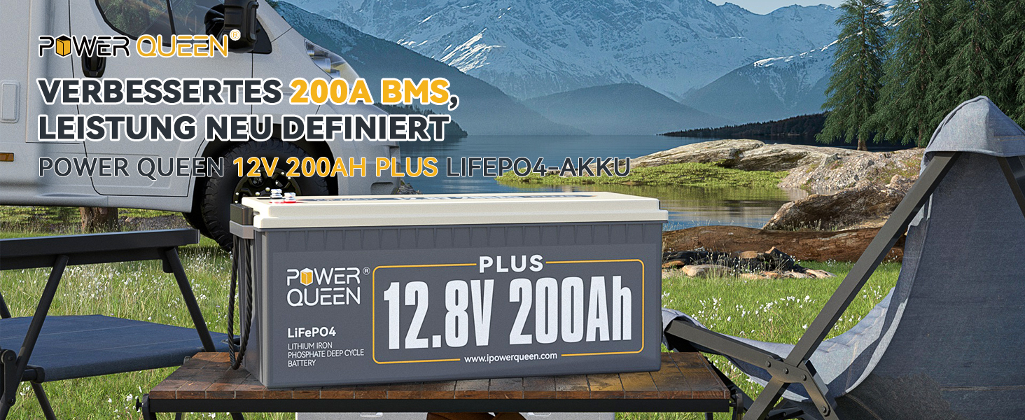 Power Queen LifePo4 Battery 12 V 200 Ah Plus LiFePO4 Battery Lithium Battery Deep Cycle Battery Rechargeable Supply Battery with BMS Over 4000 Life Cycles for Motorhomes Campers Caravans