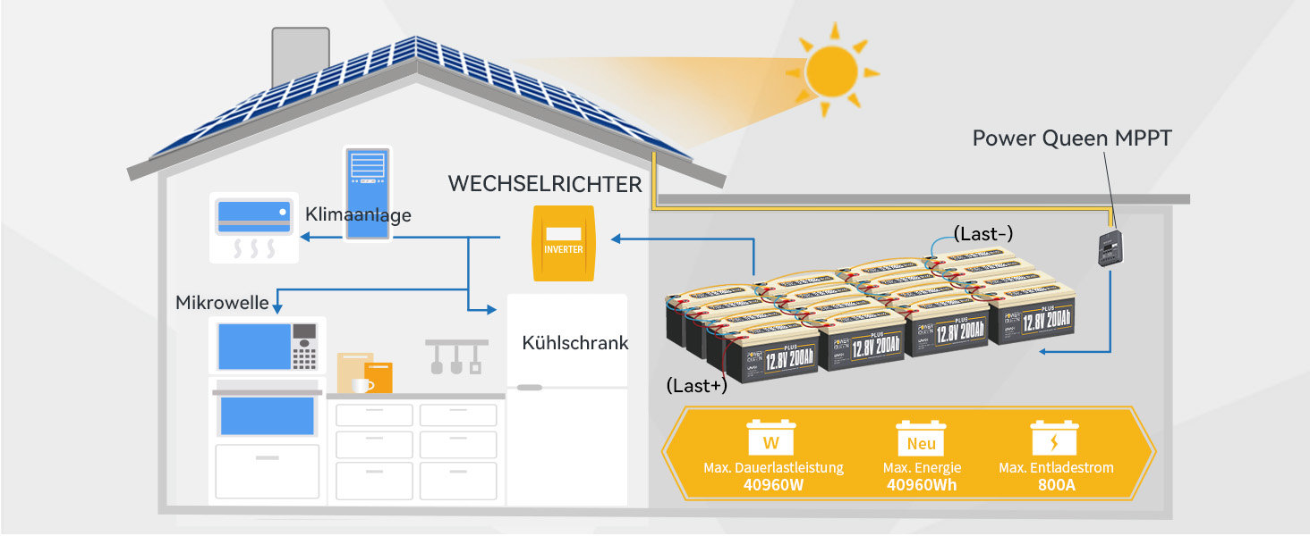 [Max. 40960 Wh Energie Speicherung] Power Queen 12,8 V 200 Ah Plus Lithium Akku 12 V unterstütz 4 Akkus in Reihenschaltung und 4 Akkus in Parallelschaltung (Max. 4R4P), um mehere Kapazität (200 Ah, 400 Ah, 600 Ah, Max. 800Ah) und höhere Spannung (12,8 V, 25,6 V, 38,4 V, Max. 51,2 V). Mit 16 Akkus kann die 51,2 V 800 Ah Batteriesystem Mit 40960 Wh Energie erreichen.