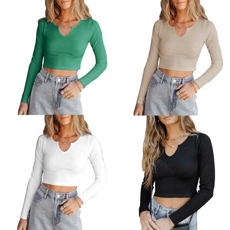 Long sleeve tops for women, stylish neckline with v notch design, cropped length, slim fit shows off your curves.
