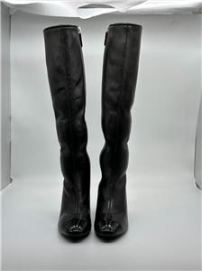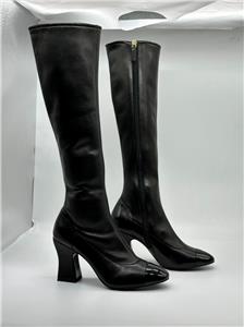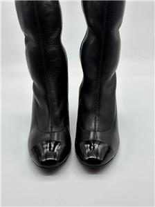 These black stretch lambskin leather boots feature an patent leather cap toe and interwoven leather and chain interlocking CC logo on the back of the curved 3" leather heel. Full side zip. Padded leather insole and leather sole. Made in Italy. Designer color: Black.