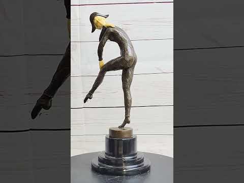 This captivating sculpture beautifully captures the grace and elegance of a woman dancing across the stage. Adorned in a skin-tight body suit with intricate diamond patterns and embellishments, she exudes confidence and poise. Her unique hat, reminiscent of a pirate's hat, adds a touch of whimsy to her ensemble, while her cute booties complete the look.