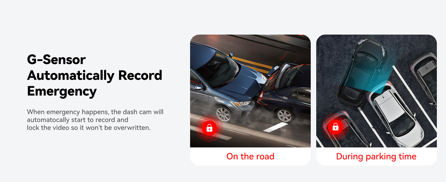 24H Non-Stop Parking Monitor-With the dedicated hardware kit plugged in , F7N dashcam can not only monitor the surrounding environment under time-lapse mode , but also automatically detect a collision and lock up the video with the help of embedded G-sensor.