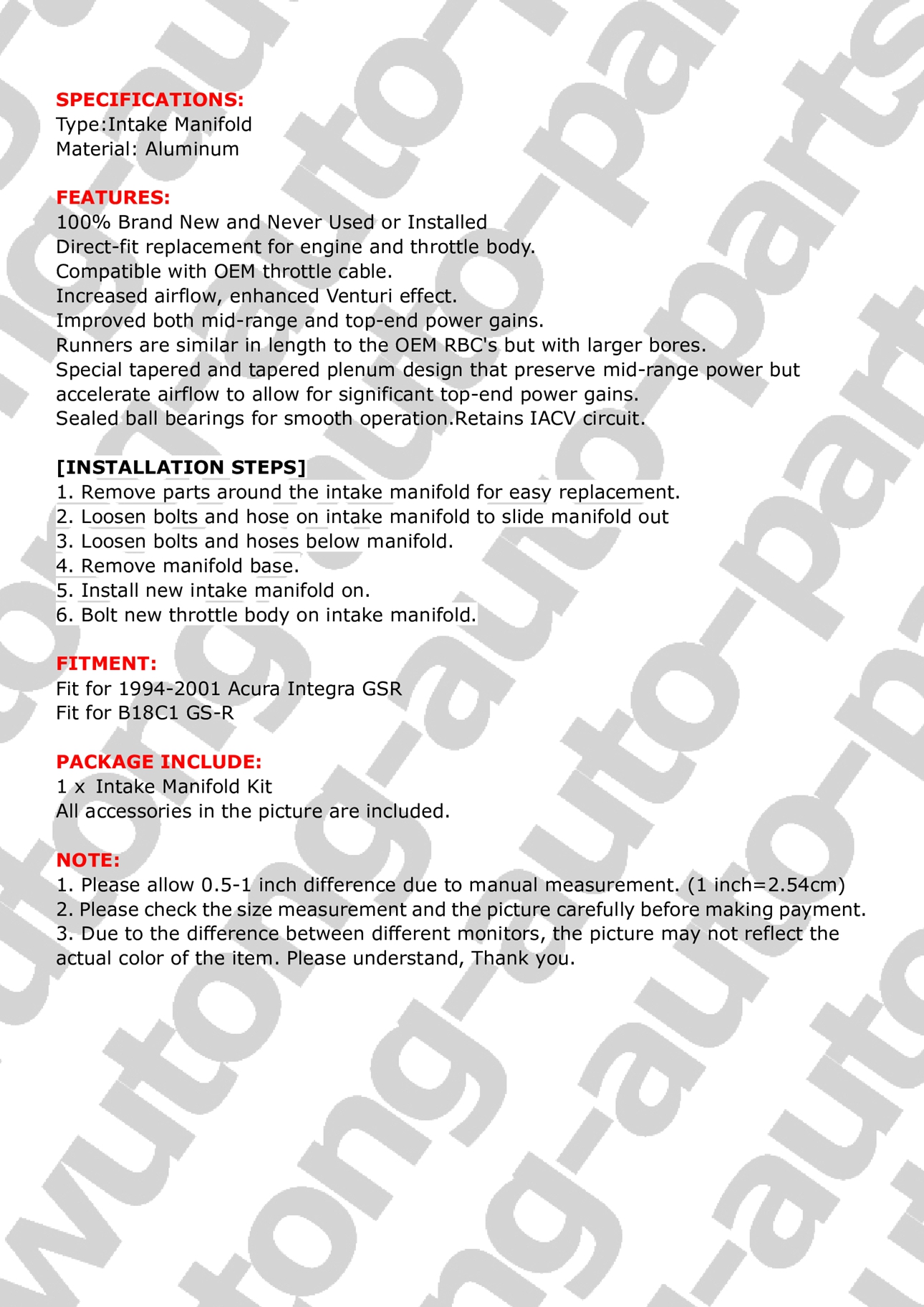 Pro Series Intake Manifold For 1994-2001 Acura Integra GSR B18C1 DC2 DC4 Black