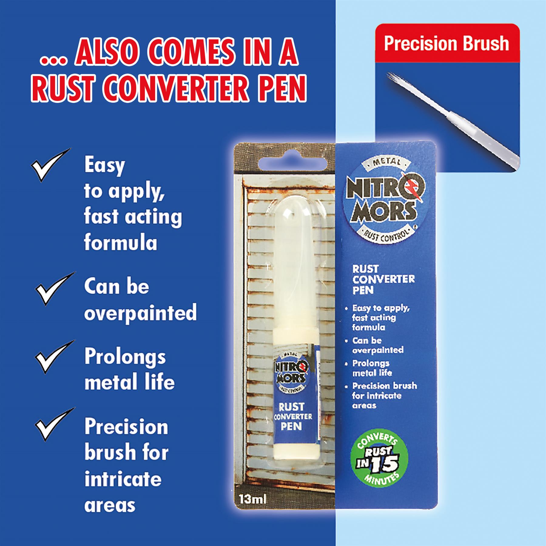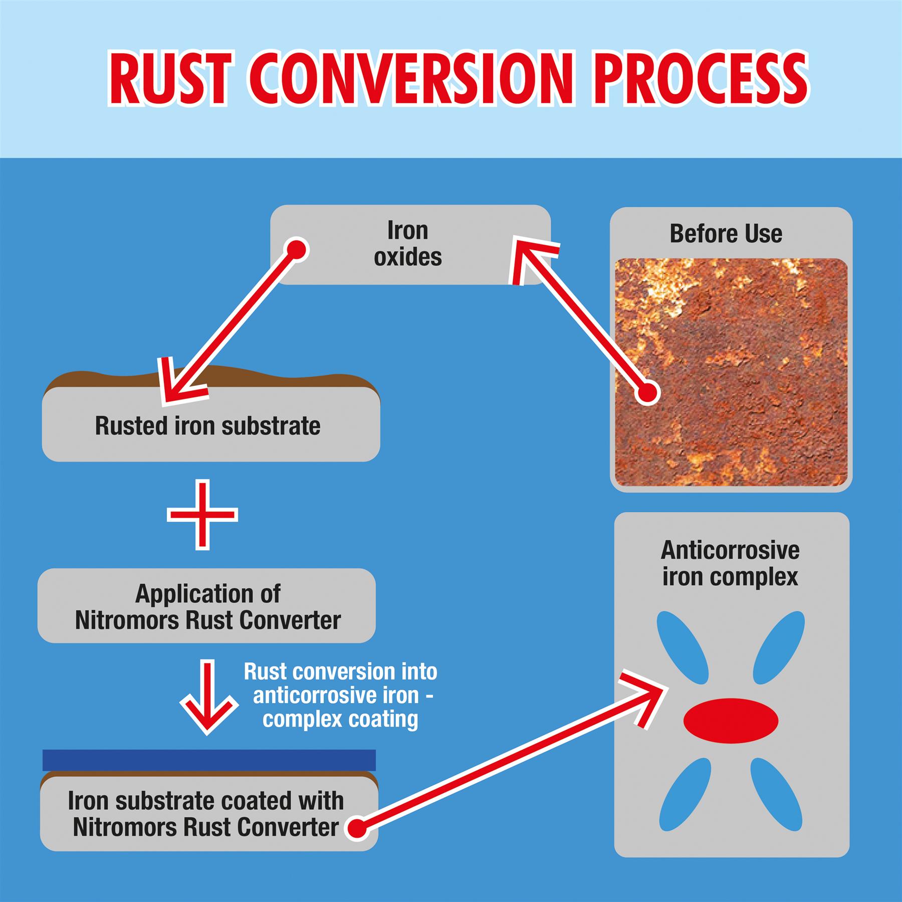 Nitromors Rust Converter rapidly get to work converting rust into a stable compound in just 15 minutes. Formulated to be fast acting and easy to apply, Nitromors Rust Converter simply needs to be applied to the rusted surface and left to dry! For best results and to maximise the longevity of your treated metal surface, simply paint the surface over with Nitromors Rust Primer or Rust Armour.