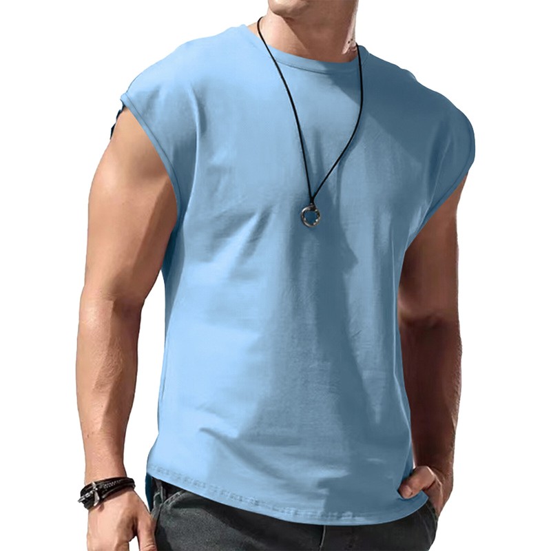 The solid color for this men’s round neck t-shirt is simple but not boring, sleeveless, perfect for showing your arm muscles.