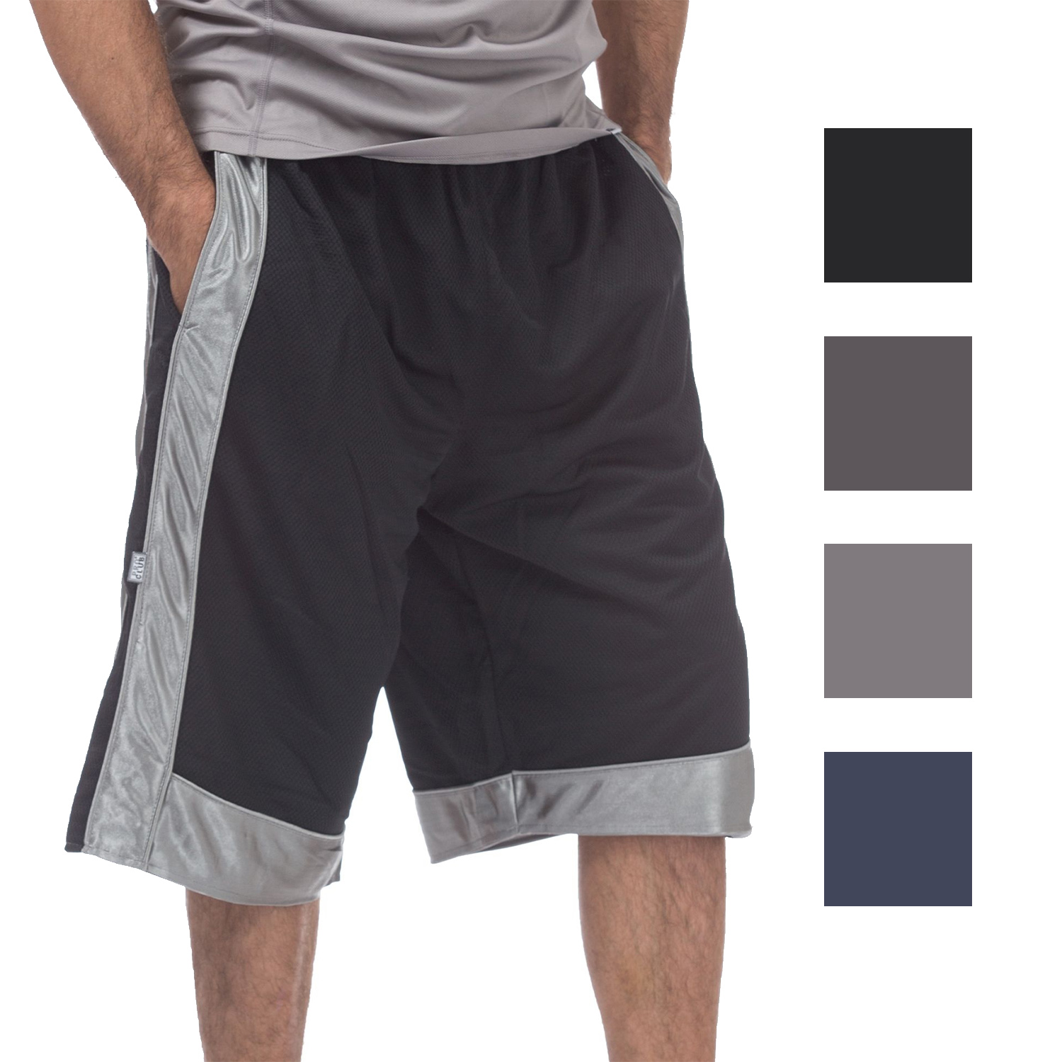 MODERN STYLE - Basketball styled shorts with solid stripe down each side and across leg openings, two front pockets, and a right rear pocket with zipper for additional storage. Perfect for summer leisure wear and all year round activewear.