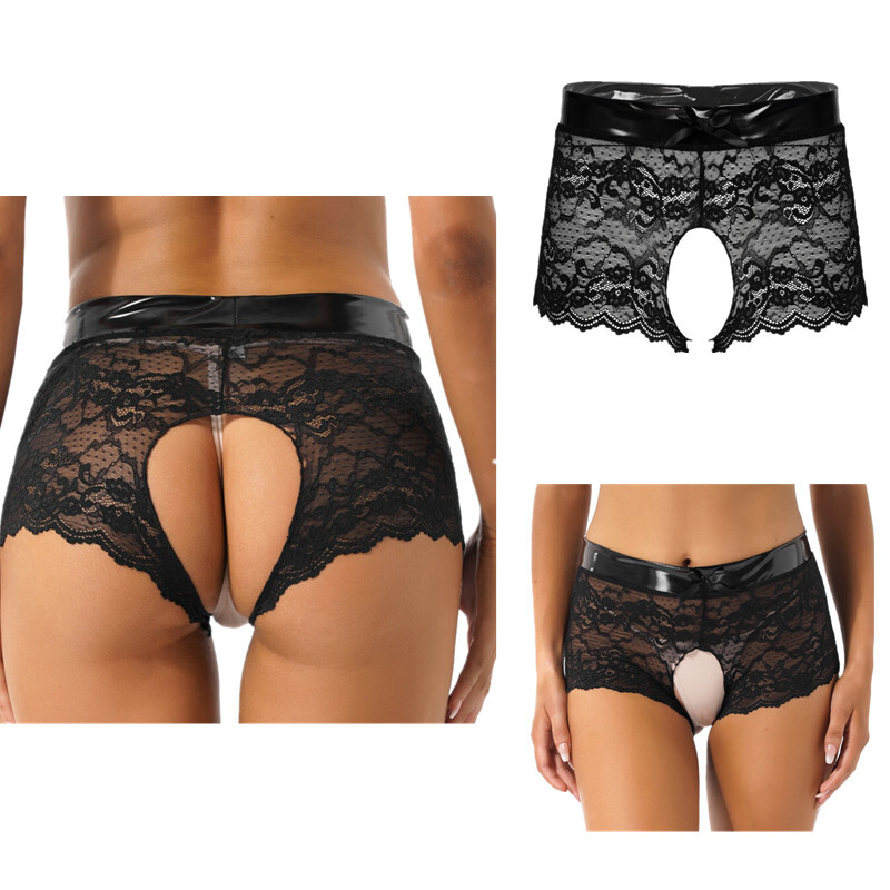 Women Back Hollow Out Lace Bowknot Crotchless Briefs Mesh Patchwork Lingerie Underwear.