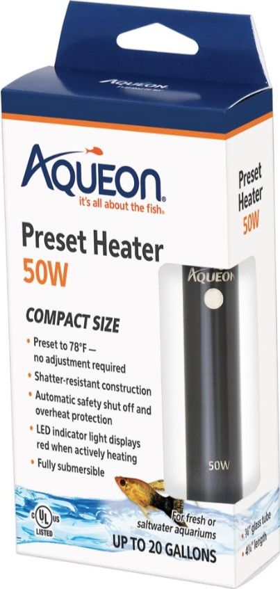 * Preset to 78°F, no adjustment required * Fully submersible with shatter-proof construction * Maintains the perfect temperature for tropical fish * For fresh and saltwater aquariums
