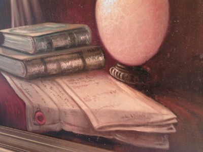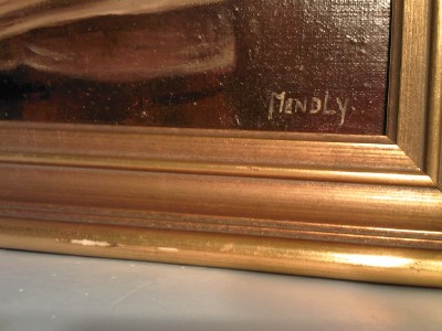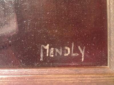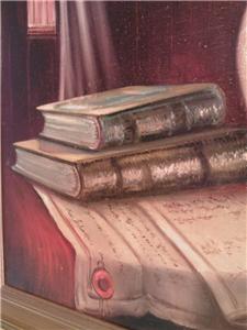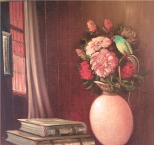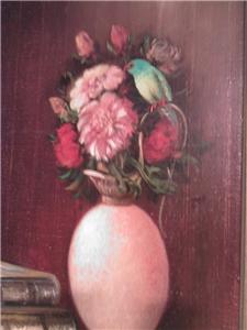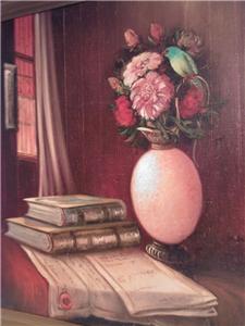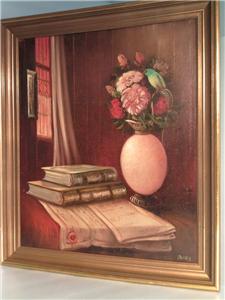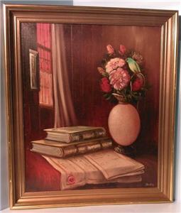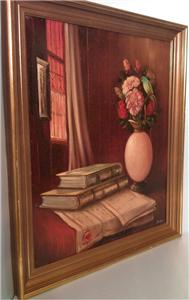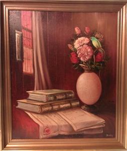 | **********************PHOTOS BELOW********************** ORIGINAL SIGNED MENDLY OIL ON CANVAS PAINTING of BOOKS & FLOWERS with BIRD. It is framed in a wood frame that looks to be hand-painted. It has SCHERTLE GALLERIES on the back of the frame (frame has minor edge wear (see photos)). Frame is approximately 27-3/4" tall x 23-3/4" wide, canvas is 24" tall x 20" wide, visible image is approximately 23-5/8" tall x 19-5/8" wide. |