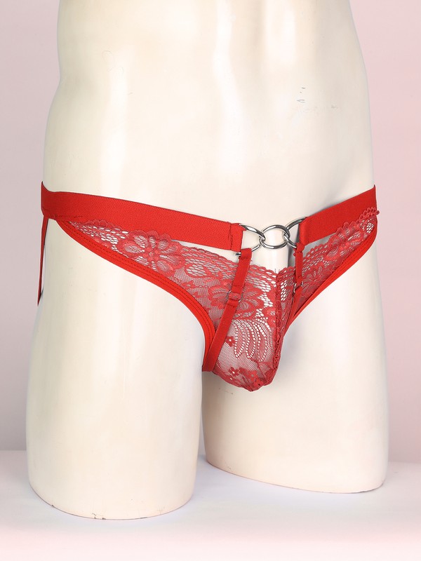 Low rise with comfy elastic waistband, front with see through mesh bulge pouch, open butt design.