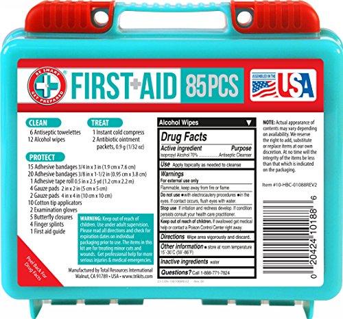 This new 85 piece first aid kit from Total Resources is ideal for use in the home, at the jobsite, in the car, on the sports field. This kit is compact and easy to take with you, where ever you multi-purpose first aid kit includes:CLEAN• 18 alcohol prep padsTREAT• 1 instant cold compress• 2 antibiotic ointmentPROTECT• 15 adhesive bandages (3/4 in x 3 in)• 20 adhesive bandages (3/8 in x 1-1/2 in)• 1 adhesive tape roll (0.5 in x 2.5 yd)• 4 sterile gauze pads (2 in x 2 in)• 2 sterile gauze pads (4 in x 4 in)• 10 cotton tip applicators• 2 nitrile gloves• 5 butterfly closures• 4 finger splints• 1 first aid guide85 pieces of First Aid; packed in a durable compact plastic case for convenient storage and easy access.