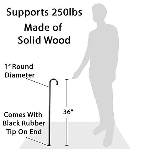 - WALKING CANE FOR MEN AND WOMEN: A round handle wood cane for women or men that is solid black wood. A black cane that supports 250 lbs weighs, is light, and has a height of 36". A black rubber tip keeps the cane from sliding and will not scratch the floor