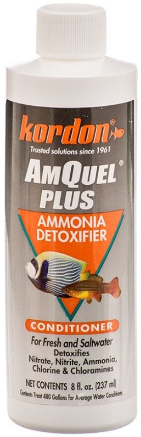 Kordon AmQuel Plus Ammonia Detoxifier water conditioner protects fishes and invertebrates by eliminating Nitrite, Nitrate, and all forms of Ammonia, Chloramines, and Chlorine. It removes fishs toxic pheromones and toxic organics and does not affect the waters pH. AmQuel Plus is safe to use in reef and live rock aquariums.