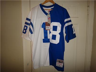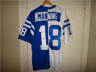 Peyton Manning 1998 Mitchell & Ness Indianapolis Colts Men's NFL Throwback Royal/White Split Legacy jersey. This awesome football jersey includes the colors and graphics of both royal and white uniforms of your favorite team. You'll always be in the right one whether you're cheering in the stands at home or while on an epic road trip.
