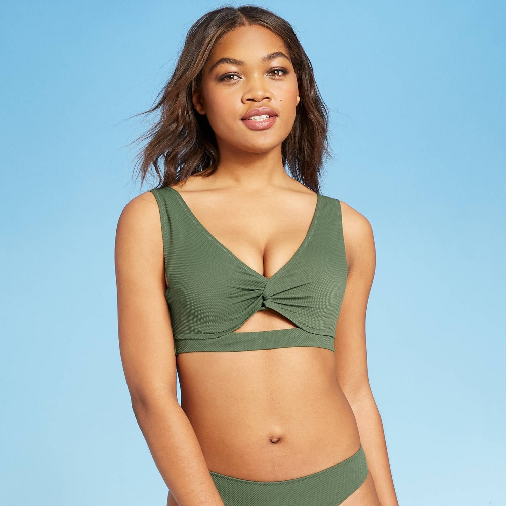 Embrace summer days by the waves with the Light Lift Twist Front Long Textured Bikini Top from Shade and Shore. This cute swimsuit top features a palm green hue with twist detailing on the front for a look that's perfect for sunny summer days at the beach or on the boardwalk. Its made from durable fabric with added spandex for improved mobility, while a back-tie closure with a crisscross back provides a secure, comfortable fit. Sewn-in cups provide extra coverage and comfort, while the underwire creates the ideal look. Whether youre walking along the shore or boardwalk, this textured bikini top is sure to have you feeling a little summer joy. Size: 32B. Gender: female. Age Group: adult. Pattern: Solid. Material: Nylon.