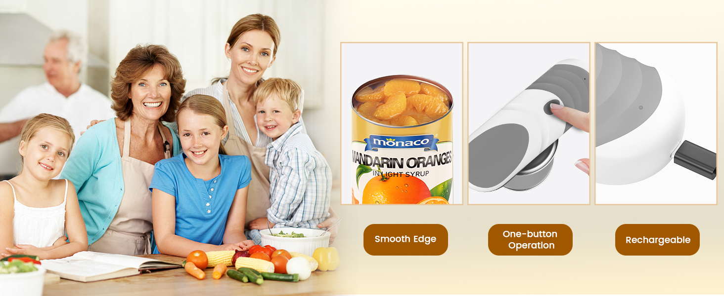 Our Electric Can Opener features a one-touch button for easy operation. Two taps to open any cans with our electric can opener. Push the button to turn it on. It cuts cans 360° along the lid. Push the button again to stop. So hassle-free!
