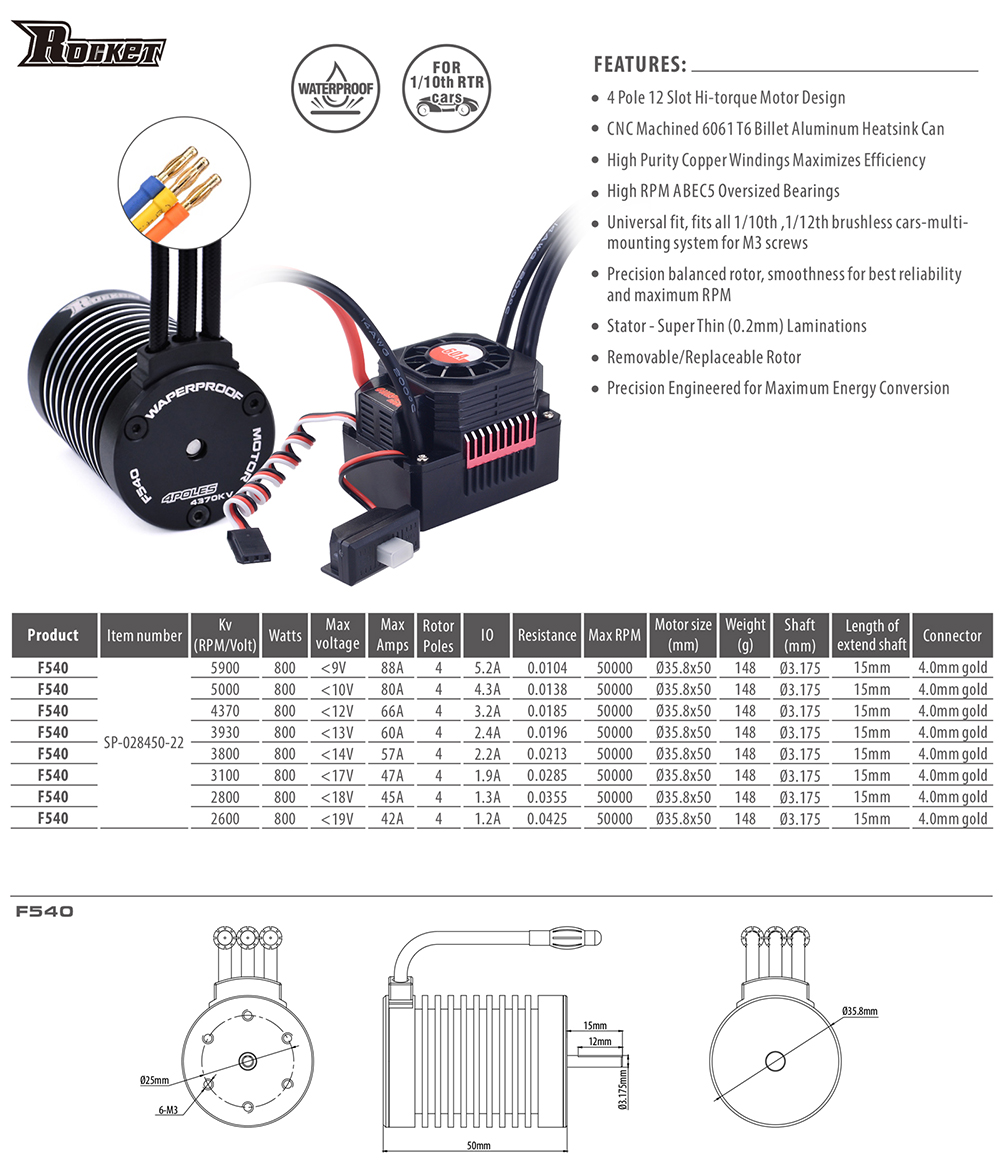 Rocket F540 Waterproof Brushless Sensorless Motor 5900KV 3930KV 4370KV 3100KV w/60A ESC for 1/10 Tamiya Axial Redcat 1/12 12428 RC Car