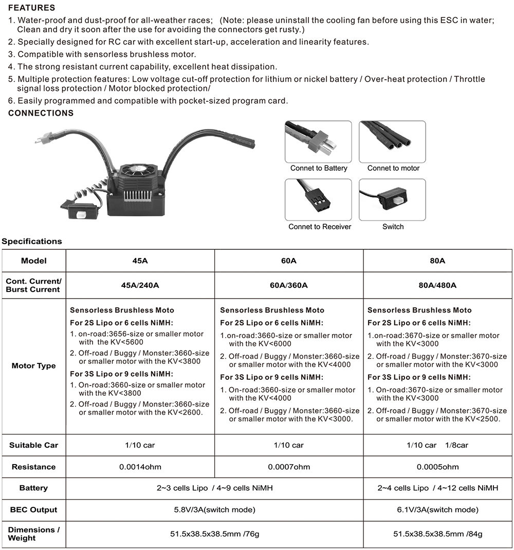 This is Electronic Speed Controller (ESC) for car. High power system for RC model is very dangerous, so please read this manual carefully.