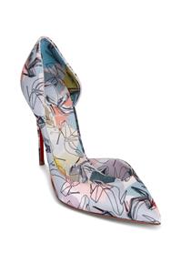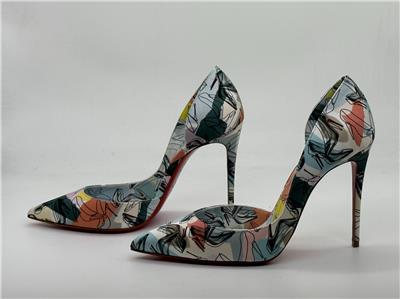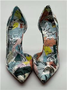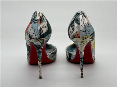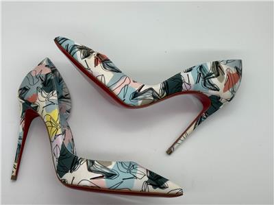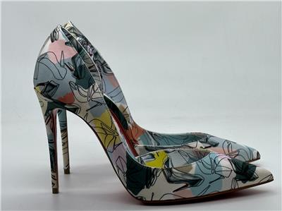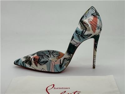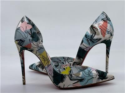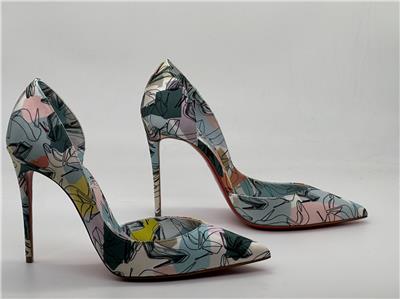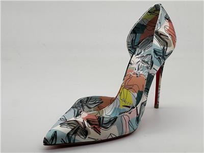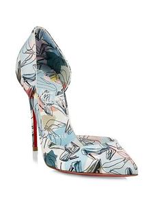 Christian Louboutin's Iriza pumps boast a half d'Orsay style to contour the foot's natural shape. Made in Italy of shoe printed silk, this flattering pair is anchored by a towering stiletto heel that showcases the maison's signature red sole. Silk upper. Point toe. Slip-on. Leather lining. Leather sole. Self-covered stiletto heel, 100mm.
