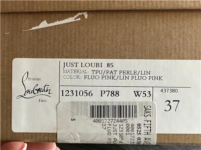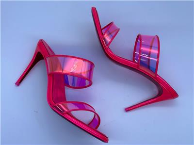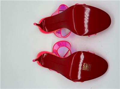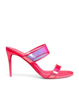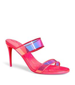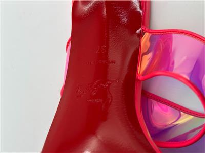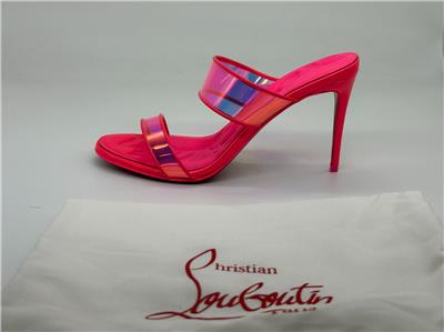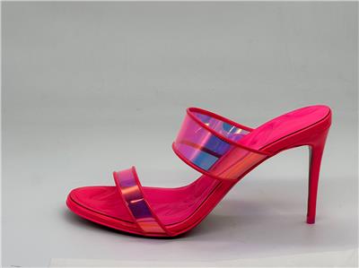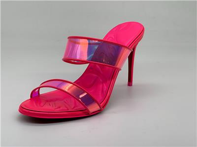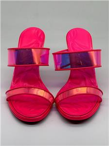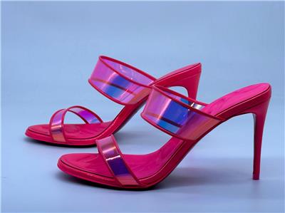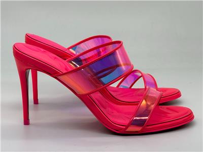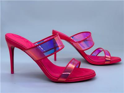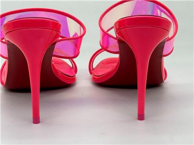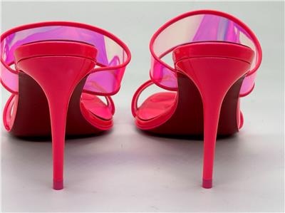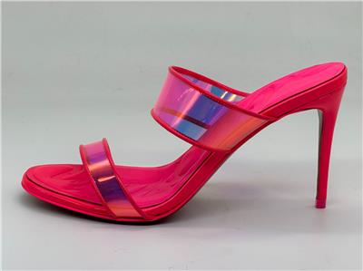 Christian Louboutin JUST LOUBI 85 TPU Clear Heels Sandals Shoes Iridescent pink straps and a puffy insole add fun to a lofty slide sandal featuring an iconic, nail-lacquer red sole. 85mm heel TPU and Patent Leather upper, leather lining/leather sole Made in Italy Designer color: Fluo Pink SIZE: 37 EU (Insole measures 9.25", Heel: 3.25")