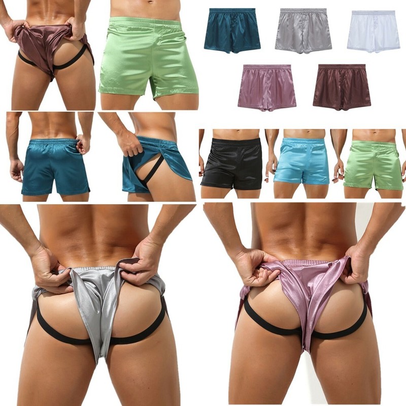 Mens Solid Color Low Waist Satin Boxers Underwear Side Split Elastic Waistband Shorts.