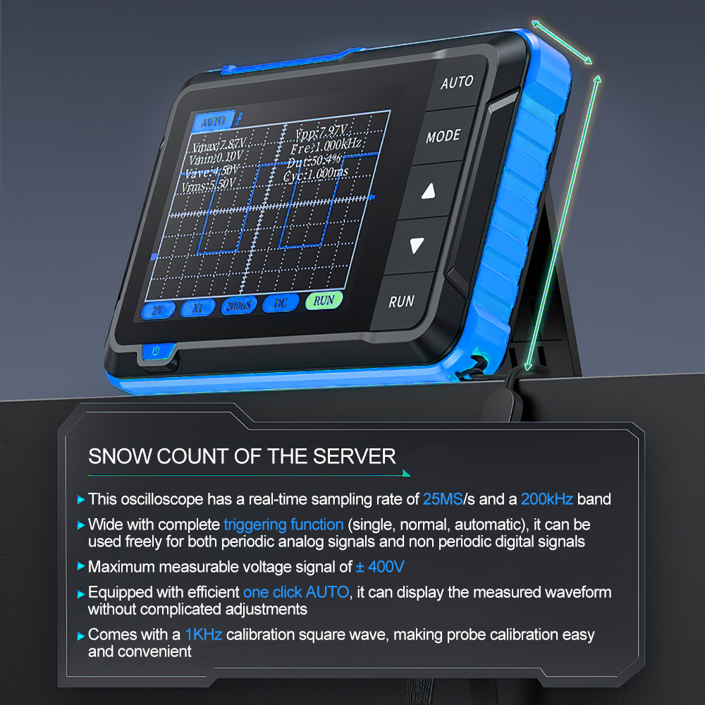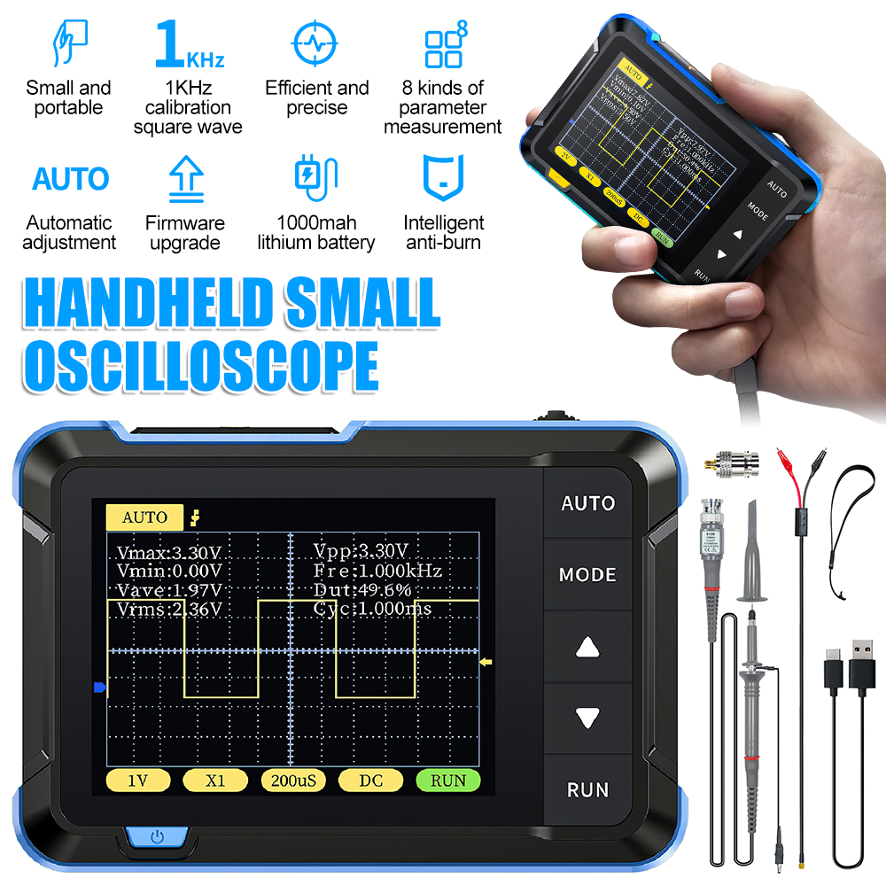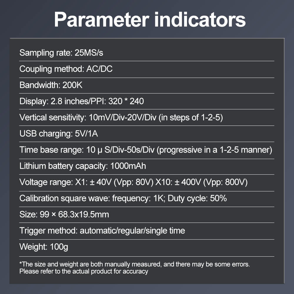 * The oscilloscope has a real-time sampling rate of 2.5MS/s, a bandwidth of 200KHz, and complete trigger functions (single, normal and automatic).