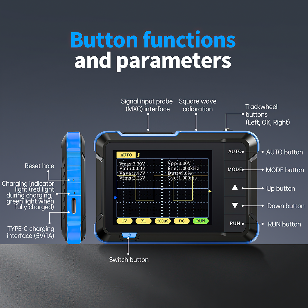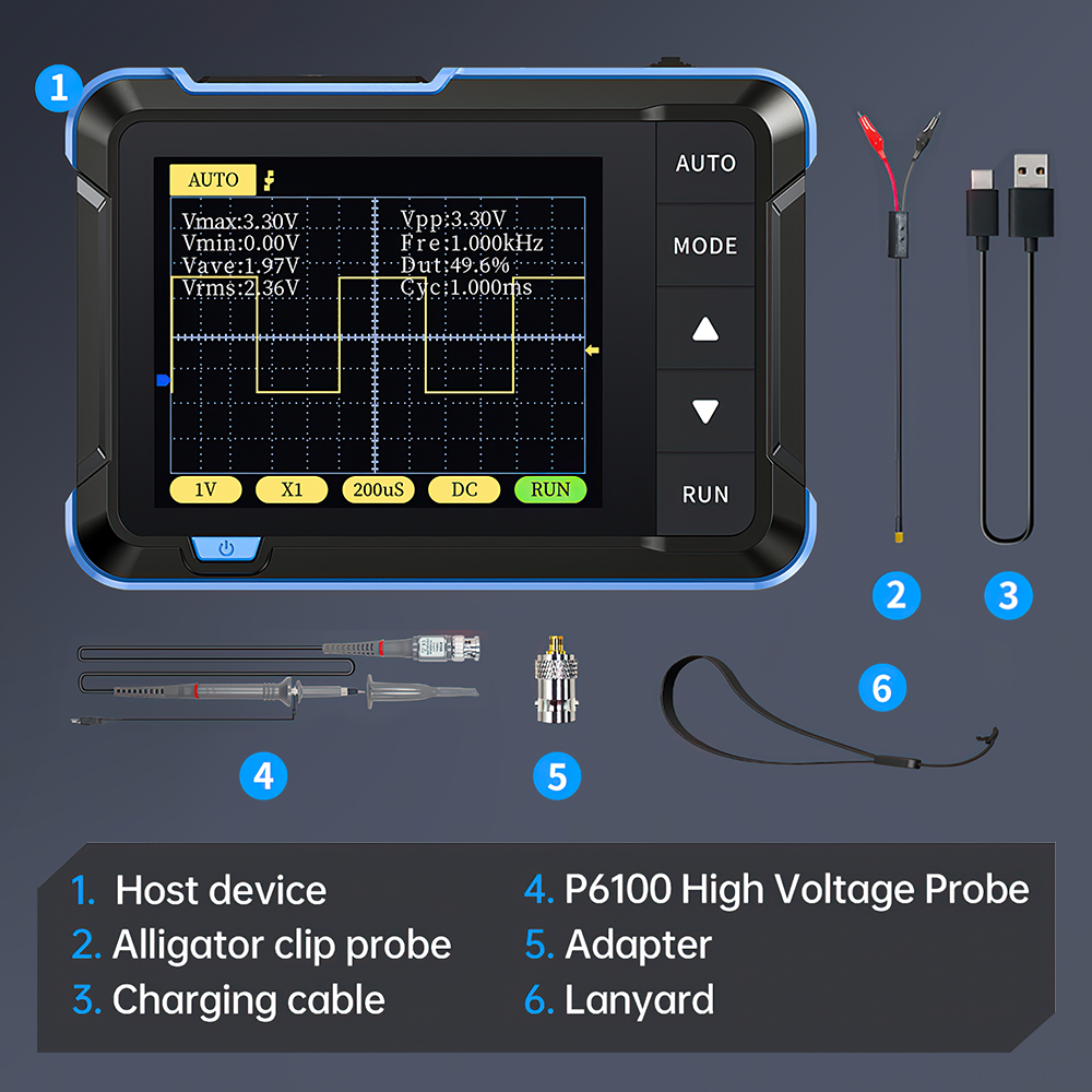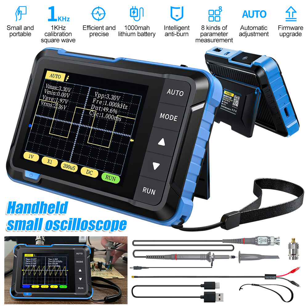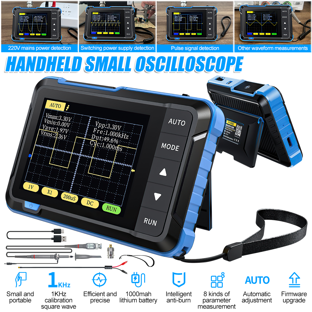 * The oscilloscope has a real-time sampling rate of 2.5MS/s, a bandwidth of 200KHz, and complete trigger functions (single, normal and automatic).