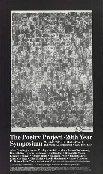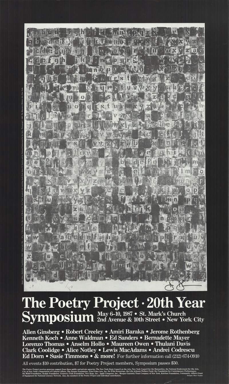 Additional Details: This original poster, created by renowned artist Jasper Johns for The Poetry Project's 20th Year Symposium in 1987, is a compelling piece that merges art and language. Titled Alphabets, the poster features Johns' iconic grid of bold letters and numbers, infuséd with his signature flag and target motifs. The poster is hand-signed by Jasper Johns in black marker in the bottom right corner, enhancing its authenticity and value. The signature adds a personal touch from one of the most influential artists of the 20th century, making it a prized collectible.