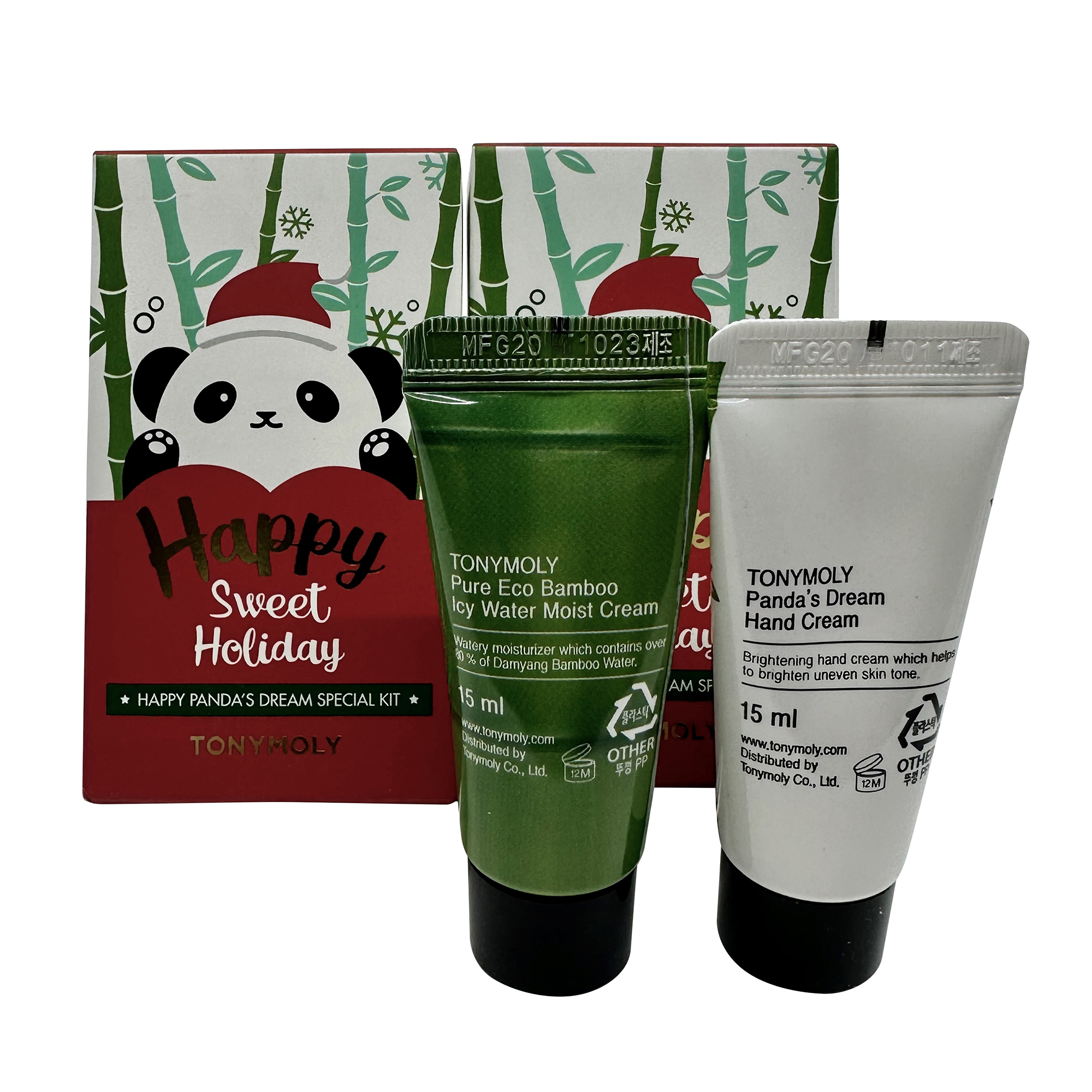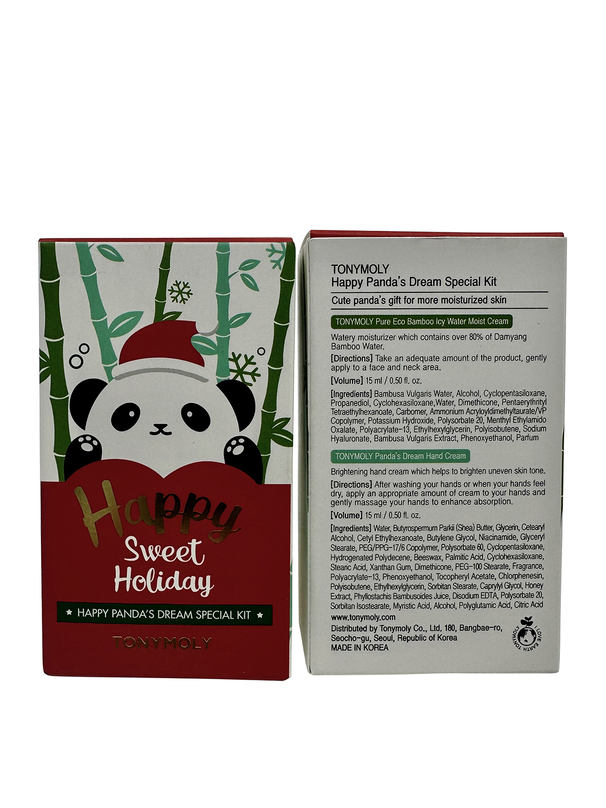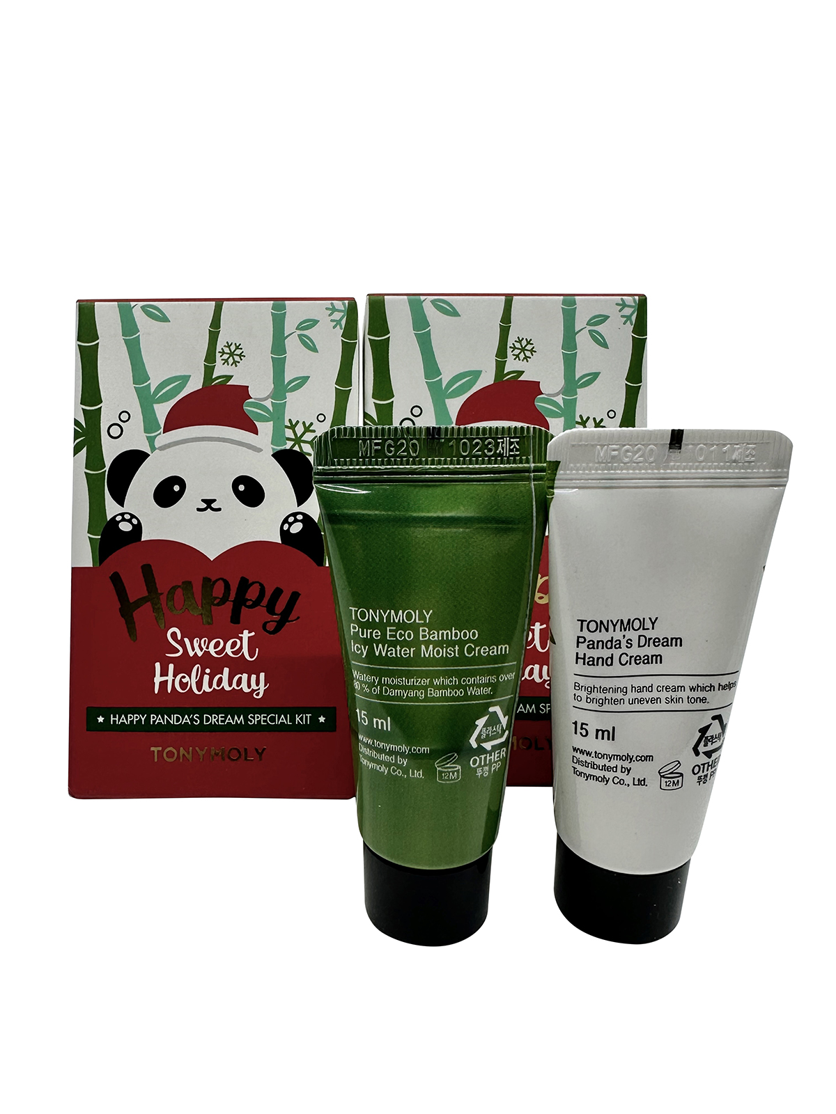 TonyMoly Happy Panda�s Dream Special Skincare Kit is an ultra moisturizing set for face and hands. The perfect combination of Korean Beauty skincare to maintain your skin nourished and healthy. Within each kit you will receive one Pure Eco Bamboo Icy water Moist Cream 15 ml and one Panda�s Dream hand Cream 15 ml. These creams strengthen and protect your skin from free radicals, irritants, dryness, and rough texture. They maintain your skins elasticity and natural moisture balance. Made rich in ceramides and natural oils to nourish skin without clogging pores. How to use: Apply creams day and night. Massage gently in a circular motion. TonyMoly is a world recognized skincare and cosmetics brand. Started in 2006 in Korea, it has become one of the top selling Korean beauty lines, known for its fun and unique designs and high quality ingredients. It is also well known for its affordability and proven results.
