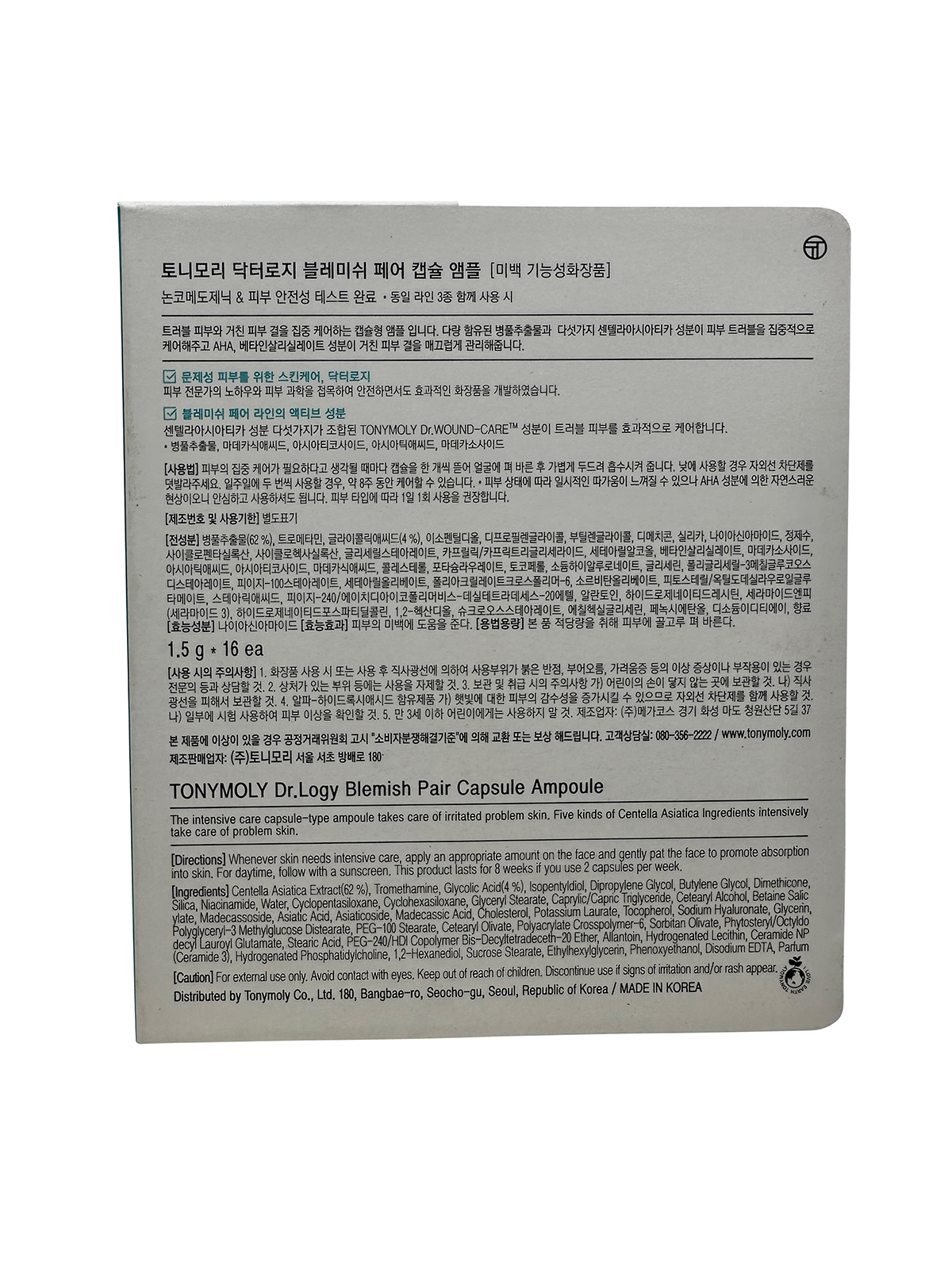 TonyMoly Dr. Logy Blemish Pair Capsule Ampule is an anti blemish treatment for those with oily skin and blemish prone skin. Made with Salicylic acid to help exfoliate skin, unclog pores, and reduce the appearance of blemishes by targeting acne causing bacteria. Centella asiatica extract helps to soothe and calm the skin. It reduces redness and inflammation associated with blemishes, while also promoting skin healing and repair. Tea tree oil is a natural ingredient that possesses antibacterial and anti-inflammatory properties. It can help combat acne-causing bacteria and reduce the severity of blemishes. Witch hazel extract has astringent properties, helping to tighten the pores and control excess oil production. It can also provide soothing effects to irritated skin. Hyaluronic acid is a hydrating helps to moisturize the skin without clogging pores. Helps to balance the skin's moisture levels and prevent excessive dryness. Various botanical extracts, such as green tea, chamomile, or aloe vera, may be included in blemish focused ampoules. These extracts provide additional soothing and antioxidant benefits for the skin.