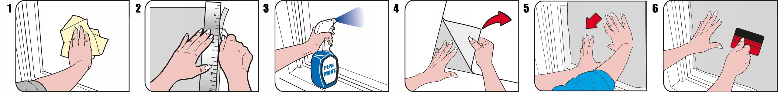 Die Folie sorgfältig auf der Scheibepositionieren, die Kanten anpassen und festdrücken. Mit einer Rakel dasWasser von der Mitte zu den Rändern hin ausstreichen, bis die Folie vollständig klar ist.