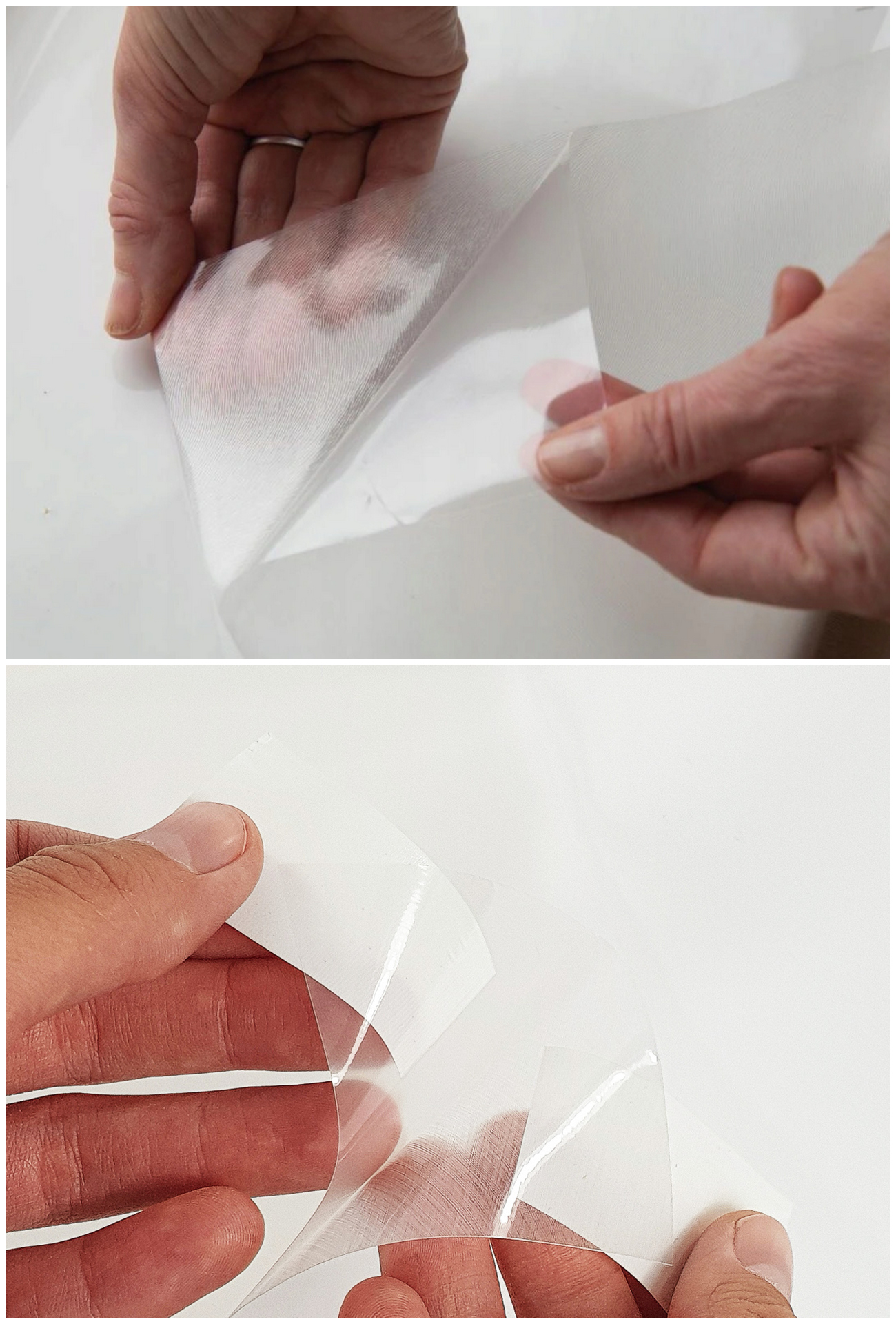 Die Folie hat eine Schutzschicht (durchsichtig), die entfernt werden muss, sonst haftet sie nicht auf der Oberfläche.